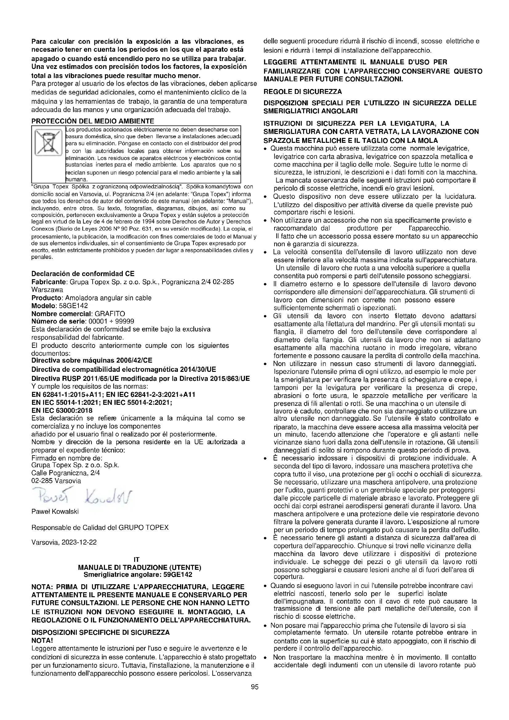 I prodotti alimentati elettricamente non devono essere smaltiti con i rifiuti domestici, ma devono essere portati in strutture adeguate per lo smaltimento. Per informazioni sullo smaltimento, rivolgersi al rivenditore del prodotto o alle autorità locali. I rifiuti di apparecchiature elettriche ed elettroniche contengono sostanze inerti per l'ambiente. Le apparecchiature non riciclate rappresentano un rischio potenziale per l'ambiente e la salute umana. "Grupa Topex Spółka z ograniczoną odpowiedzialnością". Spółka komandytowa con sede legale a Varsavia, ul. Pograniczna 2/4 (di seguito: "Grupa Topex") informa che tutti i diritti d'autore sul contenuto del presente manuale (di seguito: "Manuale"), compresi, tra gli altri. Il testo, le fotografie, i diagrammi, i disegni e la sua composizione appartengono esclusivamente a Grupa Topex e sono tutelati dalla legge del 4 febbraio 1994 sul diritto d'autore e sui diritti connessi (Gazzetta Ufficiale 2006 n. 90 Poz. 631, e successive modifiche). La copia, l'elaborazione, la pubblicazione, la modifica a fini commerciali dell'intero Manuale e dei suoi singoli elementi, senza il consenso di Grupa Topex espresso per iscritto, è severamente vietata e può comportare responsabilità civili e penali. Dichiarazione di conformità CE Produttore: Grupa Topex Sp. z o.o. Sp.k., Pograniczna 2/4 02-285 Warszawa Prodotto: Smerigliatrice angolare a batteria Modello: 58GE142 Nome commerciale: GRAFITE Numero di serie: 00001 ÷ 99999 La presente dichiarazione di conformità è rilasciata sotto l'esclusiva responsabilità del produttore. Il prodotto sopra descritto è conforme ai seguenti documenti: Direttiva macchine 2006/42/CE Direttiva sulla compatibilità elettromagnetica 2014/30/UE Direttiva RoHS 2011/65/UE, modificata dalla direttiva 2015/863/UE. E soddisfa i requisiti degli standard: EN 62841-1:2015+A11; EN IEC 62841-2-3:2021+A11 EN IEC 55014-1:2021; EN IEC 55014-2:2021; EN IEC 63000:2018 La presente dichiarazione si riferisce esclusivamente alla macchina così come immessa sul mercato e non comprende i componenti aggiunte dall'utente finale o eseguite da lui successivamente. Nome e indirizzo della persona residente nell'UE autorizzata a preparare il fascicolo tecnico: Firmato a nome di: Grupa Topex Sp. z o.o. Sp.k. 2/4 Via Pograniczna 02-285 Varsavia Paweł Kowalski Responsabile della qualità del gruppo TOPEX Varsavia, 2023-12-22