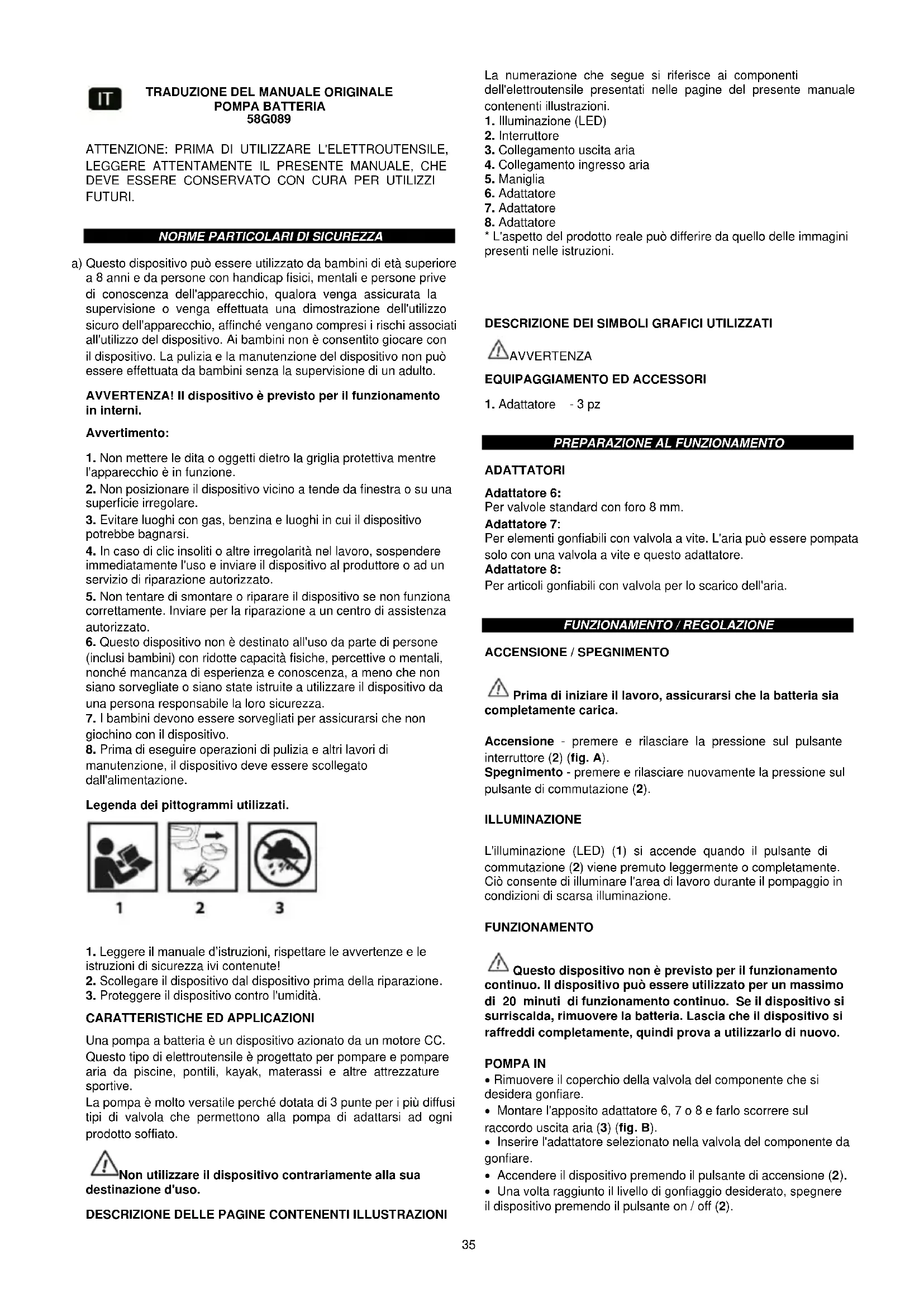 ADATTATORI Adattatore 6: Per valvole standard con foro 8 mm. Adattatore 7: Per elementi gonfiabili con valvola a vite. L'aria può essere pompata solo con una valvola a vite e questo adattatore. Adattatore 8: Per articoli gonfiabili con valvola per lo scarico dell'aria. FUNZIONAMENTO / REGOLAZIONE ACCENSIONE / SPEGNIMENTO Prima di iniziare il lavoro, assicurarsi che la batteria sia completamente carica. Accensione - premere e rilasciare la pressione sul pulsante interruttore (2) (fig. A). Spegnimento - premere e rilasciare nuovamente la pressione sul pulsante di commutazione (2). ILLUMINAZIONE L'illuminazione (LED) (1) si accende quando il pulsante di commutazione (2) viene premuto leggermente o completamente. Ciò consente di illuminare l'area di lavoro durante il pompaggio in condizioni di scarsa illuminazione. FUNZIONAMENTO Questo dispositivo non è previsto per il funzionamento continuo. Il dispositivo può essere utilizzato per un massimo di 20 minuti di funzionamento continuo. Se il dispositivo si surriscalda, rimuovere la batteria. Lascia che il dispositivo si raffreddi completamente, quindi prova a utilizzarlo di nuovo. POMPA IN