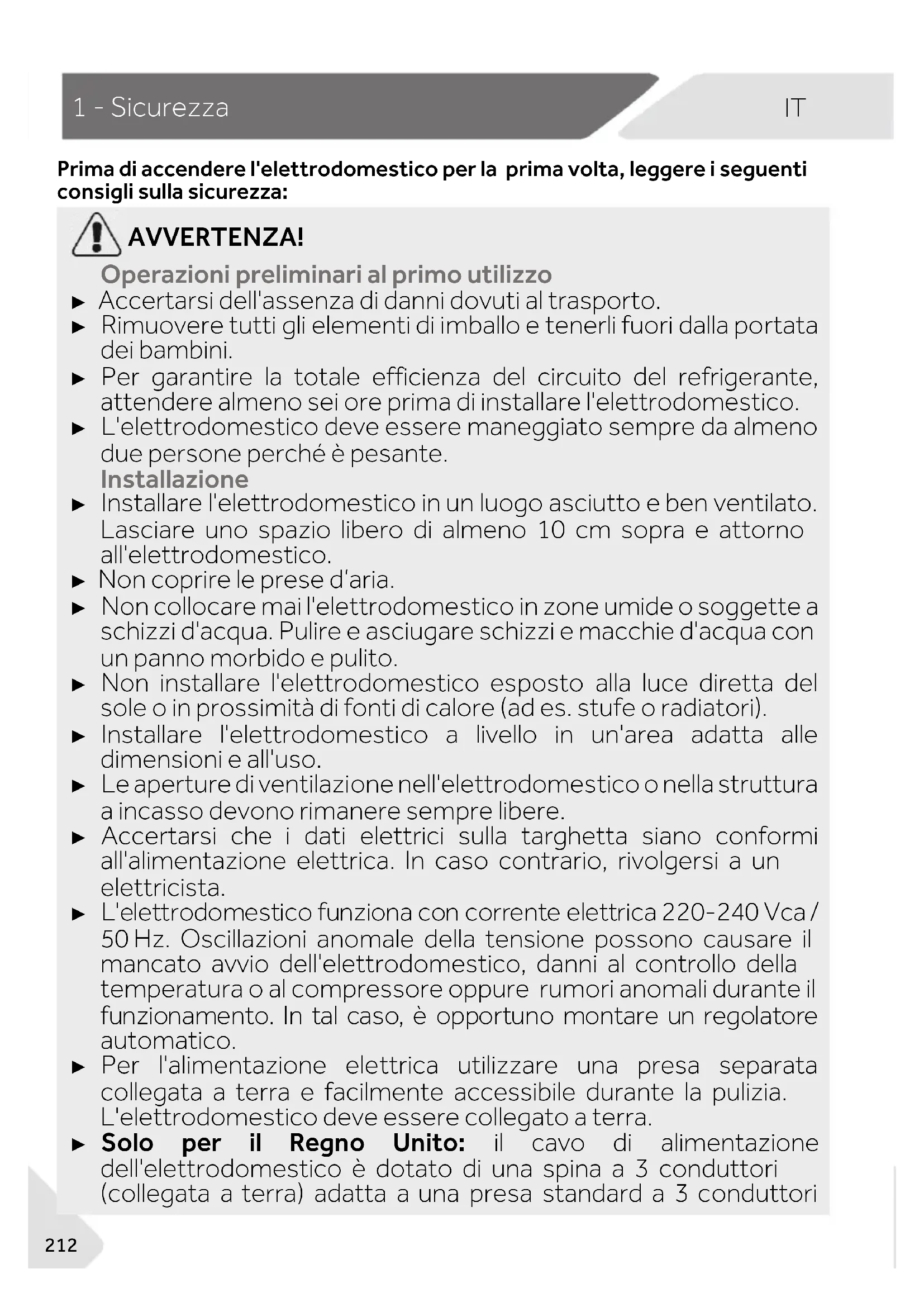Prima di accendere l'elettrodomestico per la prima volta, leggere i seguenti consigli sulla sicurezza: AVVERTENZA! Operazioni preliminari al primo utilizzo ► Accertarsi dell'assenza di danni dovuti al trasporto. ► Rimuovere tutti gli elementi di imballo e tenerli fuori dalla portata dei bambini. ► Per garantire la totale efficienza del circuito del refrigerante, attendere almeno sei ore prima di installare l'elettrodomestico. ► L'elettrodomestico deve essere maneggiato sempre da almeno due persone perché è pesante. Installazione ► Installare l'elettrodomestico in un luogo asciutto e ben ventilato. Lasciare uno spazio libero di almeno 10 cm sopra e attorno all'elettrodomestico. ► Non coprire le prese d’aria. ► Non collocare mai l'elettrodomestico in zone umide o soggette a schizzi d'acqua. Pulire e asciugare schizzi e macchie d'acqua con un panno morbido e pulito. ► Non installare l'elettrodomestico esposto alla luce diretta del sole o in prossimità di fonti di calore (ad es. stufe o radiatori). ► Installare l'elettrodomestico a livello in un'area adatta alle dimensioni e all'uso. ► Le aperture di ventilazione nell'elettrodomestico o nella struttura a incasso devono rimanere sempre libere. ► Accertarsi che i dati elettrici sulla targhetta siano conformi all'alimentazione elettrica. In caso contrario, rivolgersi a un elettricista. ► L'elettrodomestico funziona con corrente elettrica 220-240 Vca / 50 Hz. Oscillazioni anomale della tensione possono causare il mancato avvio dell'elettrodomestico, danni al controllo della temperatura o al compressore oppure rumori anomali durante il funzionamento. In tal caso, è opportuno montare un regolatore automatico. ► Per l'alimentazione elettrica utilizzare una presa separata collegata a terra e facilmente accessibile durante la pulizia. L'elettrodomestico deve essere collegato a terra. ► Solo per il Regno Unito: il cavo di alimentazione dell'elettrodomestico è dotato di una spina a 3 conduttori (collegata a terra) adatta a una presa standard a 3 conduttoriIT
