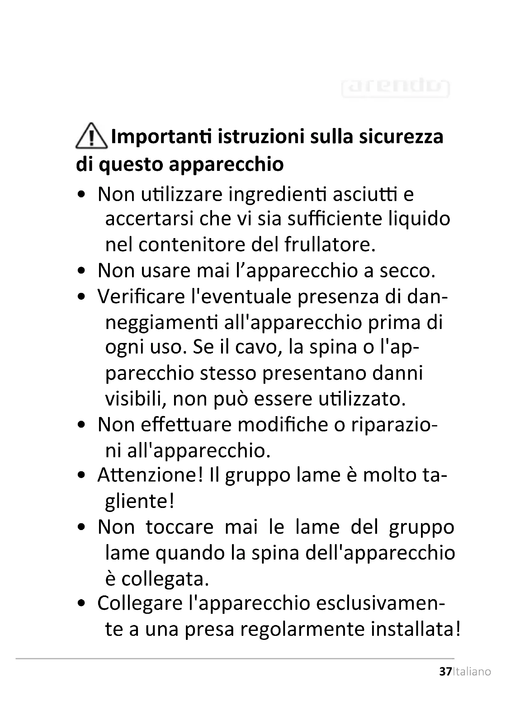 Grazie per aver scelto un prodotto di Arendo. Perutilizzare con soddisfazione l'apparecchio acquistato, si prega di leggere attendamente le seguenti istruzioni per l'uso. Prima della messa in funzione della merce consagnata, verificare che sia integra, esente da difetti e non danneggiata.