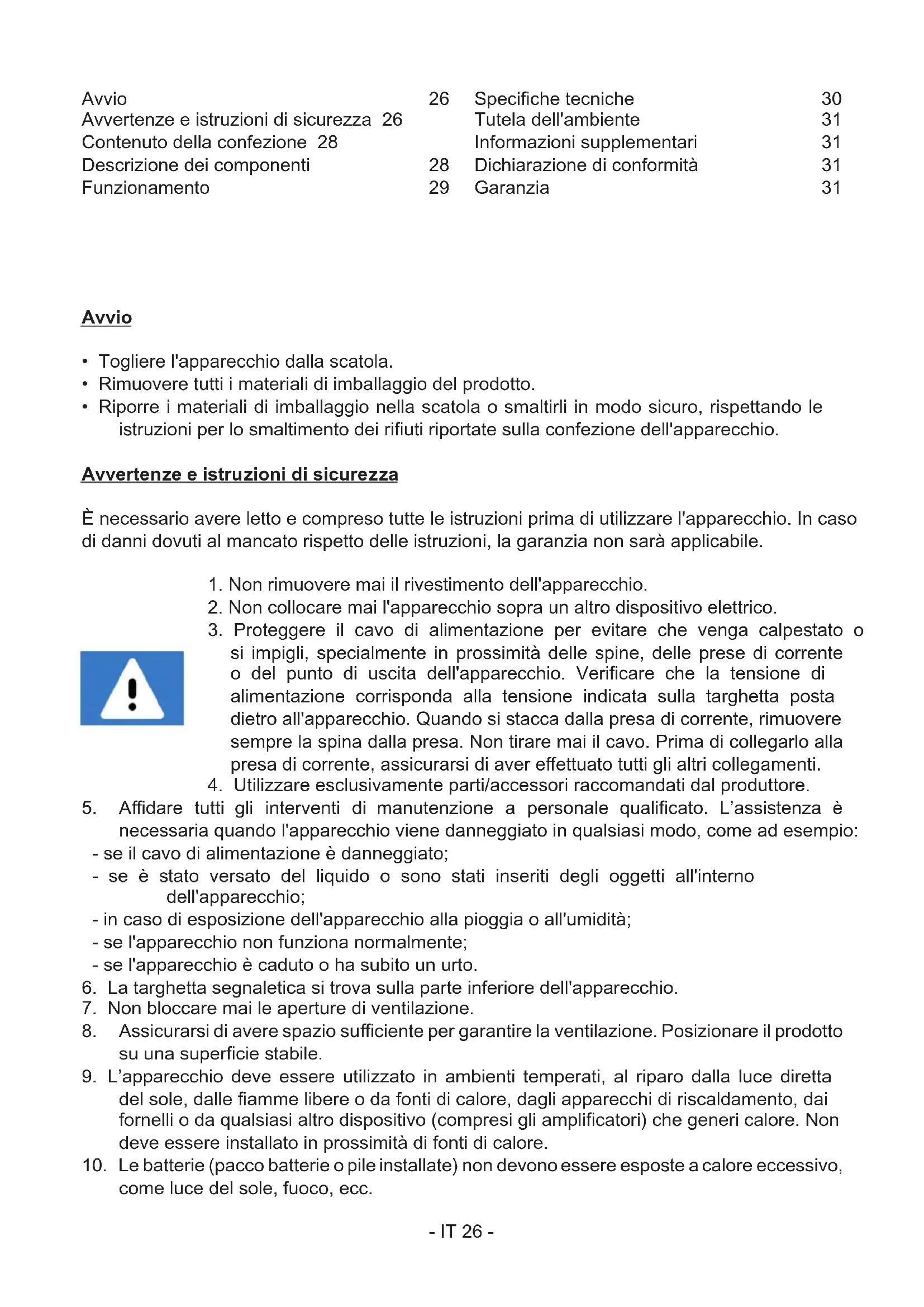 come luce del sole, fuoco, ecc. Avvio 26 Avvertenze e iruzioni di sicurezza 26 Contenuto della confezione 28 Descrizione dei componenti 28 Funzionamento 29 Speciche tecniche 30 Tutela dell'ambiente 31 Informazioni supplementari 31 Dichiarazione di conformità 31 Garanzia 31- IT 27 -