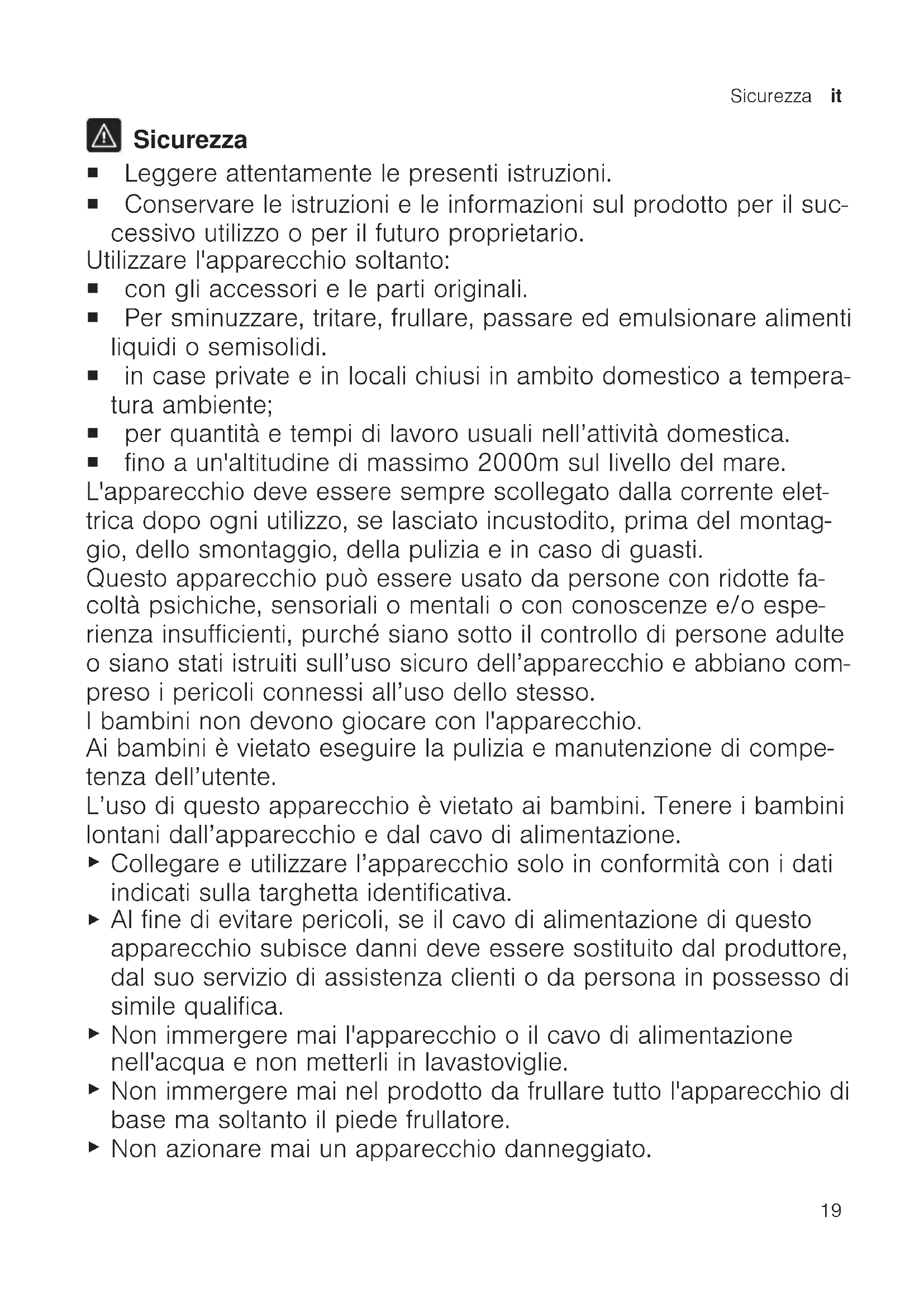 Sicurezza ¡ Leggere attentamente le presenti istruzioni. ¡ Conservare le istruzioni e le informazioni sul prodotto per il suc- cessivo utilizzo o per il futuro proprietario. Utilizzare l'apparecchio soltanto: ¡ con gli accessori e le parti originali. ¡ Per sminuzzare, tritare, frullare, passare ed emulsionare alimenti liquidi o semisolidi. ¡ in case private e in locali chiusi in ambito domestico a tempera- tura ambiente; ¡ per quantità e tempi di lavoro usuali nell’attività domestica. ¡ fino a un'altitudine di massimo 2000m sul livello del mare. L'apparecchio deve essere sempre scollegato dalla corrente elet- trica dopo ogni utilizzo, se lasciato incustodito, prima del montag- gio, dello smontaggio, della pulizia e in caso di guasti. Questo apparecchio può essere usato da persone con ridotte fa- coltà psichiche, sensoriali o mentali o con conoscenze e/o espe- rienza insufficienti, purché siano sotto il controllo di persone adulte o siano stati istruiti sull’uso sicuro dell’apparecchio e abbiano com- preso i pericoli connessi all’uso dello stesso. I bambini non devono giocare con l'apparecchio. Ai bambini è vietato eseguire la pulizia e manutenzione di compe- tenza dell’utente. L’uso di questo apparecchio è vietato ai bambini. Tenere i bambini lontani dall’apparecchio e dal cavo di alimentazione.