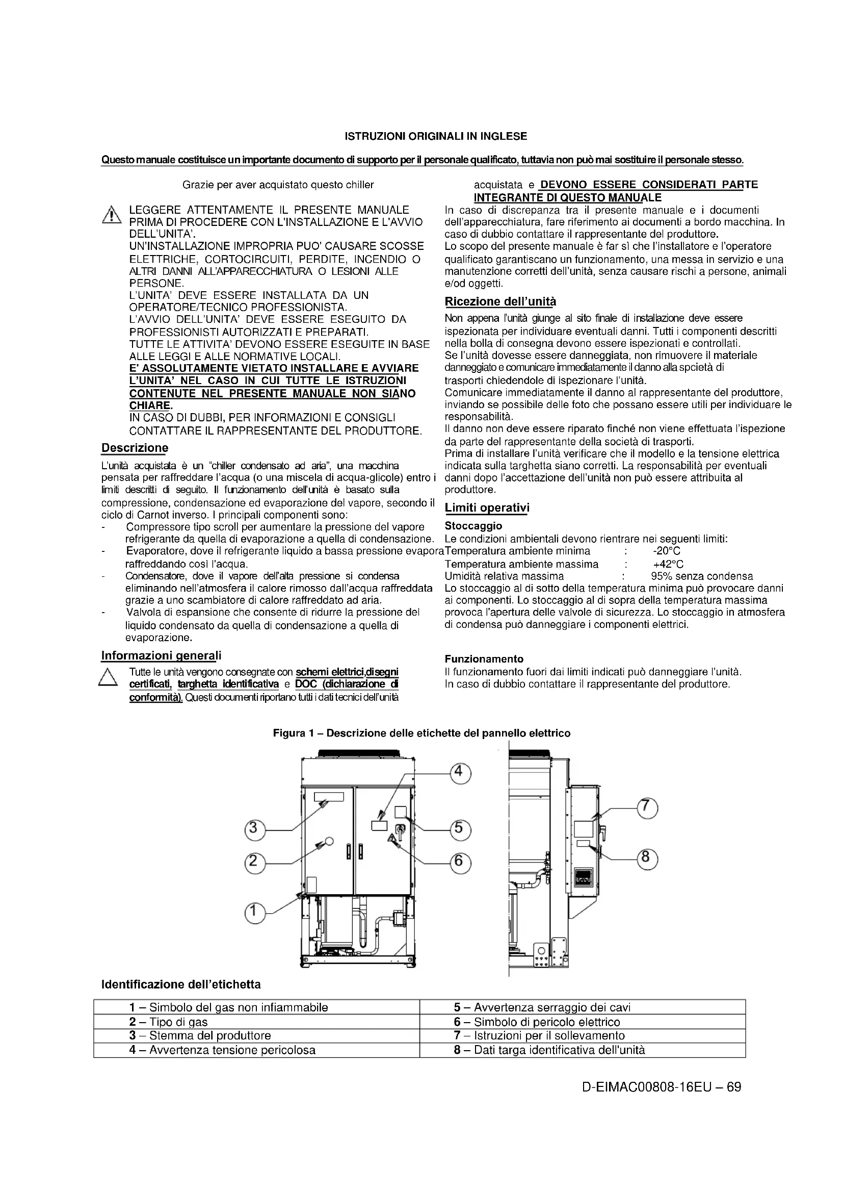 Figura 1 – Descrizione delle etichette del pannello elettrico Identificazione dell’etichetta 1 – Simbolo del gas non infiammabile 5 – Avvertenza serraggio dei cavi 2 – Tipo di gas 6 – Simbolo di pericolo elettrico 3 – Stemma del produttore 7 – Istruzioni per il sollevamento 4 – Avvertenza tensione pericolosa 8 – Dati targa identificativa dell'unitàD-EIMAC00808-16EU –70
