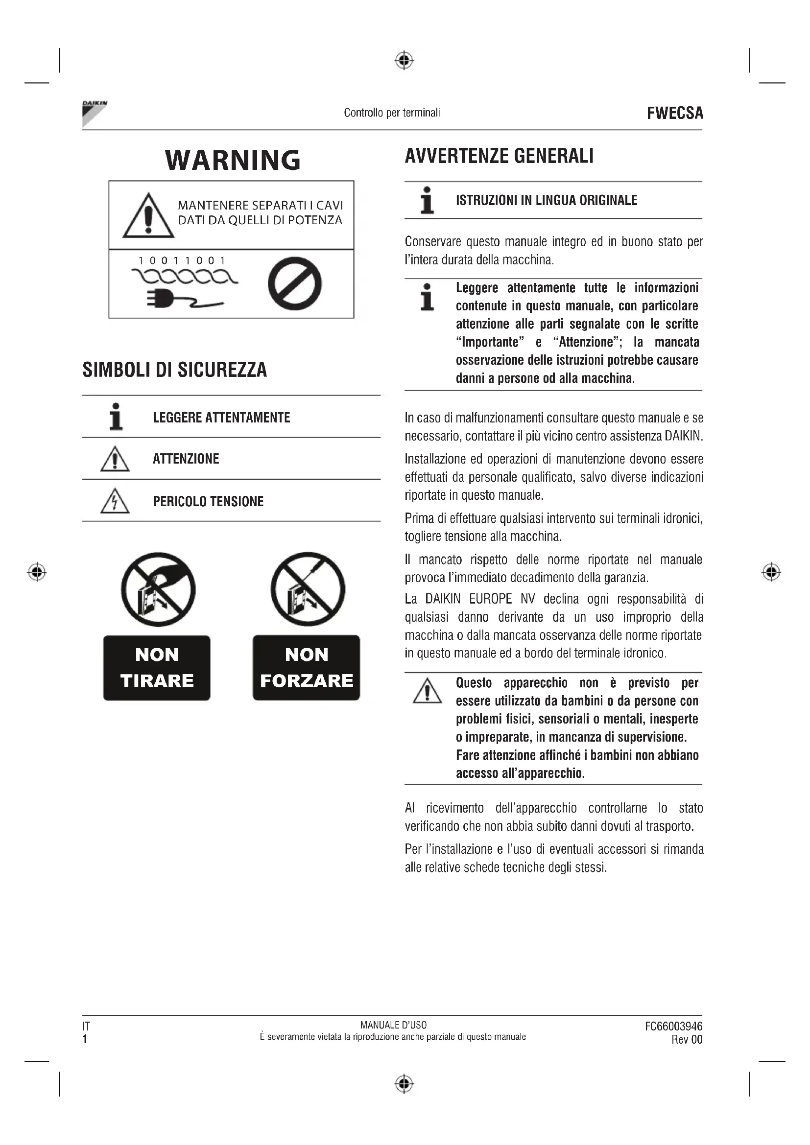 Conservare questo manuale integro ed in buono stato per l’intera durata della macchina. Leggere attentamente tutte le informazioni contenute in questo manuale, con particolare attenzione alle parti segnalate con le scritte “Importante” e “Attenzione”; la mancata osservazione delle istruzioni potrebbe causare danni a persone od alla macchina. In caso di malfunzionamenti consultare questo manuale e se necessario, contattare il più vicino centro assistenza DAIKIN. Installazione ed operazioni di manutenzione devono essere effettuati da personale qualificato, salvo diverse indicazioni riportate in questo manuale. Prima di effettuare qualsiasi intervento sui terminali idronici, togliere tensione alla macchina. Il mancato rispetto delle norme riportate nel manuale provoca l’immediato decadimento della garanzia. La DAIKIN EUROPE NV declina ogni responsabilità di qualsiasi danno derivante da un uso improprio della macchina o dalla mancata osservanza delle norme riportate in questo manuale ed a bordo del terminale idronico. Questo apparecchio non è previsto per essere utilizzato da bambini o da persone con problemi fisici, sensoriali o mentali, inesperte o impreparate, in mancanza di supervisione. Fare attenzione affinché i bambini non abbiano accesso all’apparecchio. Al ricevimento dell’apparecchio controllarne lo stato verificando che non abbia subito danni dovuti al trasporto. Per l’installazione e l’uso di eventuali accessori si rimanda alle relative schede tecniche degli stessi.FC66003946 Rev 00
