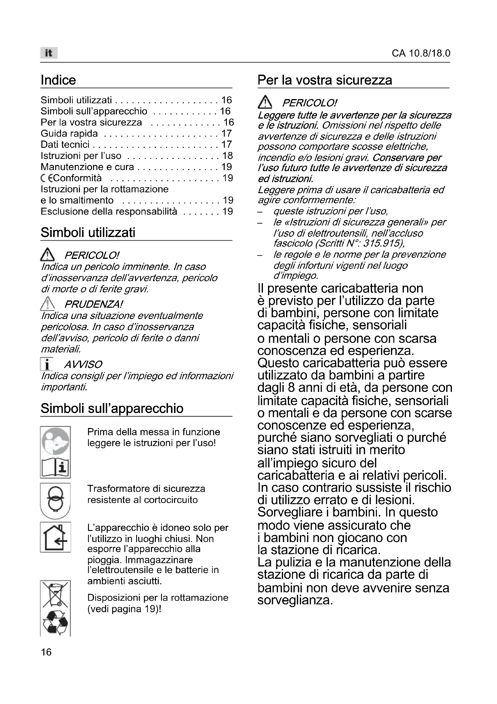 - Per la vostra sicurezza p. 16