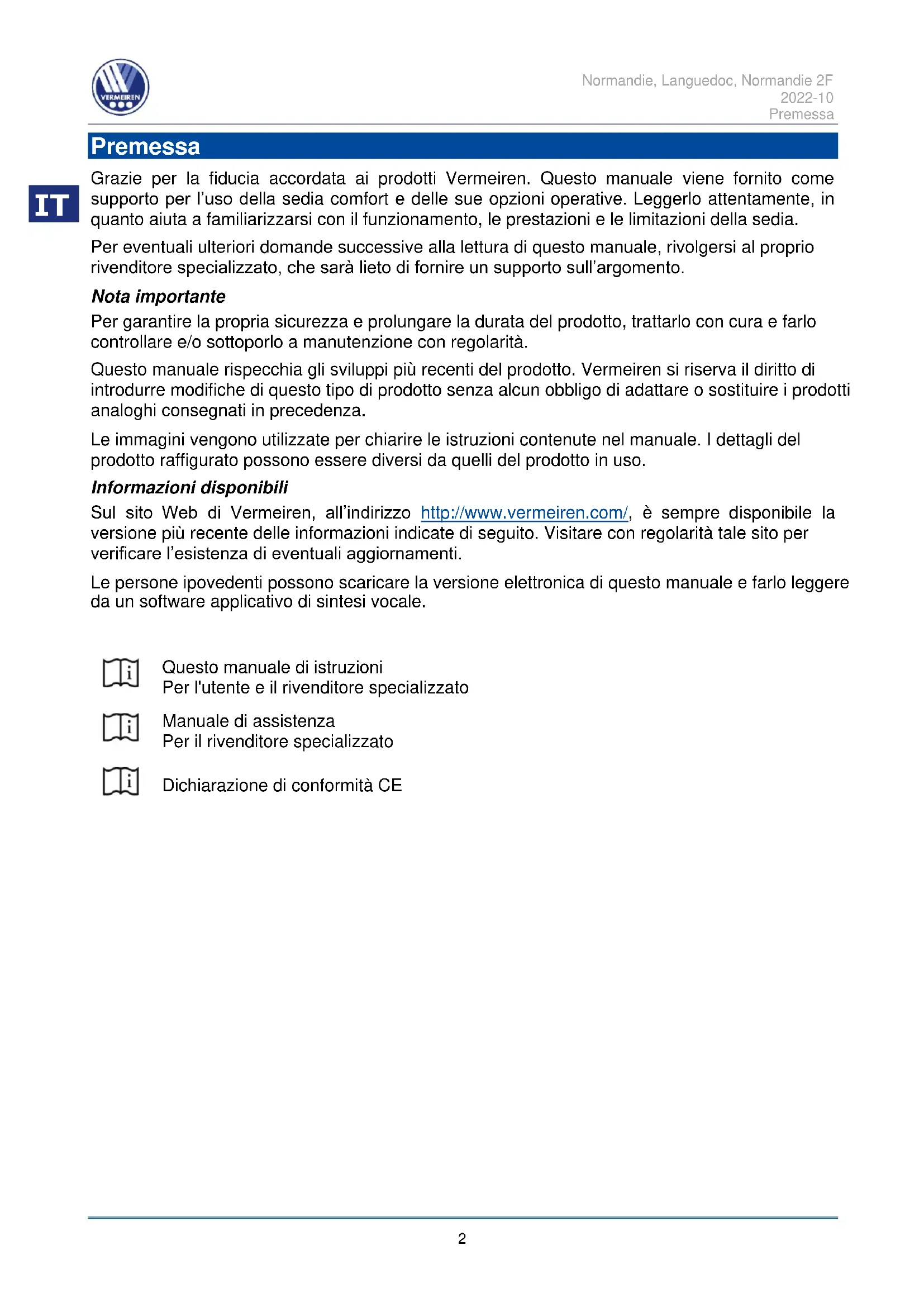 Premessa Grazie per la fiducia accordata ai prodotti Vermeiren. Questo manuale viene fornito come supporto per l’uso della sedia comfort e delle sue opzioni operative. Leggerlo attentamente, in quanto aiuta a familiarizzarsi con il funzionamento, le prestazioni e le limitazioni della sedia. Per eventuali ulteriori domande successive alla lettura di questo manuale, rivolgersi al proprio rivenditore specializzato, che sarà lieto di fornire un supporto sull’argomento. Nota importante Per garantire la propria sicurezza e prolungare la durata del prodotto, trattarlo con cura e farlo controllare e/o sottoporlo a manutenzione con regolarità. Questo manuale rispecchia gli sviluppi più recenti del prodotto. Vermeiren si riserva il diritto di introdurre modifiche di questo tipo di prodotto senza alcun obbligo di adattare o sostituire i prodotti analoghi consegnati in precedenza. Le immagini vengono utilizzate per chiarire le istruzioni contenute nel manuale. I dettagli del prodotto raffigurato possono essere diversi da quelli del prodotto in uso. Informazioni disponibili Sul sito Web di Vermeiren, all’indirizzo http://www.vermeiren.com/, è sempre disponibile la versione più recente delle informazioni indicate di seguito. Visitare con regolarità tale sito per verificare l’esistenza di eventuali aggiornamenti. Le persone ipovedenti possono scaricare la versione elettronica di questo manuale e farlo leggere da un software applicativo di sintesi vocale.