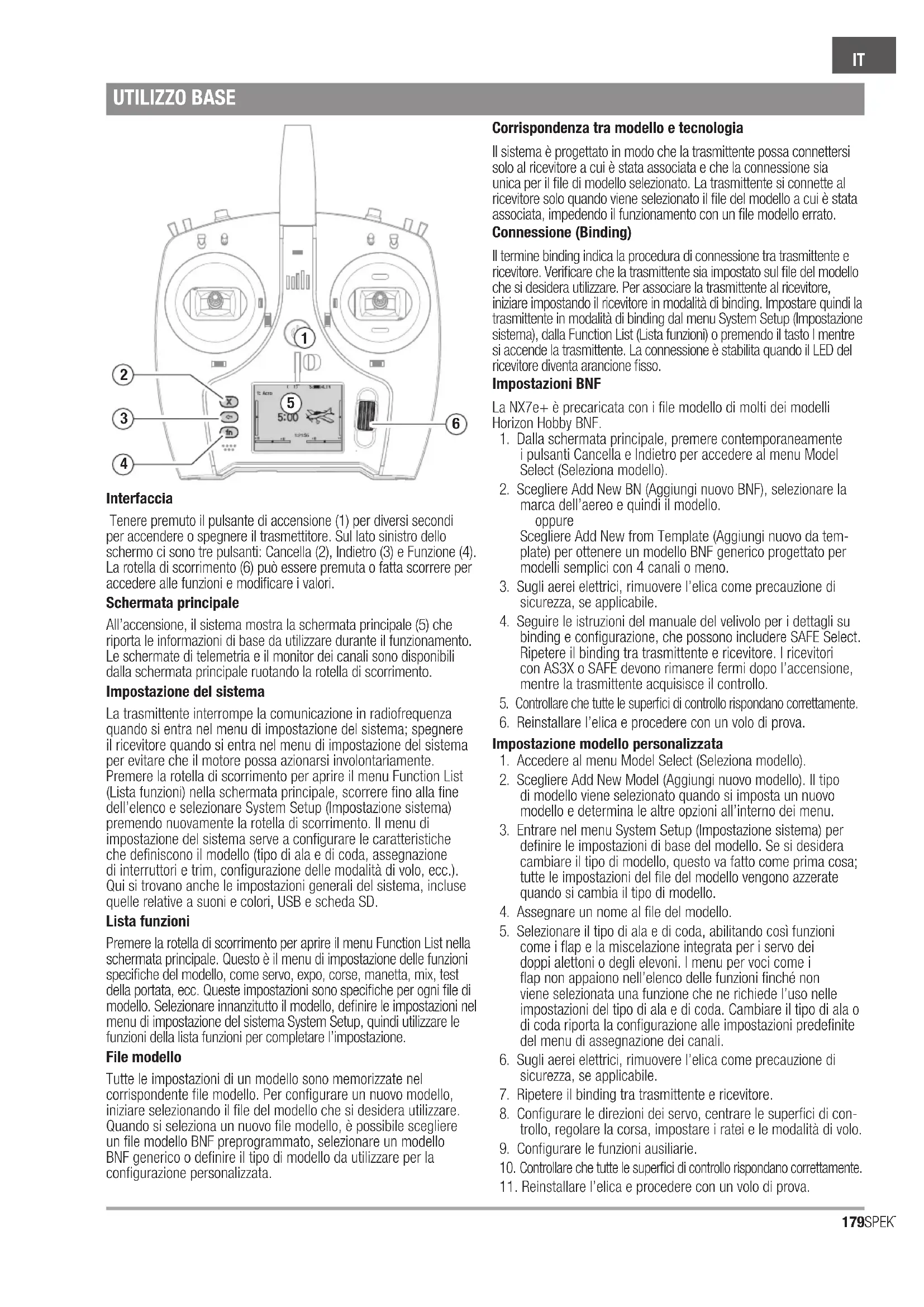 Interfaccia Tenere premuto il pulsante di accensione (1) per diversi secondi per accendere o spegnere il trasmettitore. Sul lato sinistro dello schermo ci sono tre pulsanti: Cancella (2), Indietro (3) e Funzione (4). La rotella di scorrimento (6) può essere premuta o fatta scorrere per accedere alle funzioni e modificare i valori. Schermata principale All’accensione, il sistema mostra la schermata principale (5) che riporta le informazioni di base da utilizzare durante il funzionamento. Le schermate di telemetria e il monitor dei canali sono disponibili dalla schermata principale ruotando la rotella di scorrimento. Impostazione del sistema La trasmittente interrompe la comunicazione in radiofrequenza quando si entra nel menu di impostazione del sistema; spegnere il ricevitore quando si entra nel menu di impostazione del sistema per evitare che il motore possa azionarsi involontariamente. Premere la rotella di scorrimento per aprire il menu Function List (Lista funzioni) nella schermata principale, scorrere fino alla fine dell’elenco e selezionare System Setup (Impostazione sistema) premendo nuovamente la rotella di scorrimento. Il menu di impostazione del sistema serve a configurare le caratteristiche che definiscono il modello (tipo di ala e di coda, assegnazione di interruttori e trim, configurazione delle modalità di volo, ecc.). Qui si trovano anche le impostazioni generali del sistema, incluse quelle relative a suoni e colori, USB e scheda SD. Lista funzioni Premere la rotella di scorrimento per aprire il menu Function List nella schermata principale. Questo è il menu di impostazione delle funzioni specifiche del modello, come servo, expo, corse, manetta, mix, test della portata, ecc. Queste impostazioni sono specifiche per ogni file di modello. Selezionare innanzitutto il modello, definire le impostazioni nel menu di impostazione del sistema System Setup, quindi utilizzare le funzioni della lista funzioni per completare l’impostazione. File modello Tutte le impostazioni di un modello sono memorizzate nel corrispondente file modello. Per configurare un nuovo modello, iniziare selezionando il file del modello che si desidera utilizzare. Quando si seleziona un nuovo file modello, è possibile scegliere un file modello BNF preprogrammato, selezionare un modello BNF generico o definire il tipo di modello da utilizzare per la configurazione personalizzata. Corrispondenza tra modello e tecnologia Il sistema è progettato in modo che la trasmittente possa connettersi solo al ricevitore a cui è stata associata e che la connessione sia unica per il file di modello selezionato. La trasmittente si connette al ricevitore solo quando viene selezionato il file del modello a cui è stata associata, impedendo il funzionamento con un file modello errato. Connessione (Binding) Il termine binding indica la procedura di connessione tra trasmittente e ricevitore. Verificare che la trasmittente sia impostato sul file del modello che si desidera utilizzare. Per associare la trasmittente al ricevitore, iniziare impostando il ricevitore in modalità di binding. Impostare quindi la trasmittente in modalità di binding dal menu System Setup (Impostazione sistema), dalla Function List (Lista funzioni) o premendo il tasto I mentre si accende la trasmittente. La connessione è stabilita quando il LED del ricevitore diventa arancione fisso. Impostazioni BNF La NX7e+ è precaricata con i file modello di molti dei modelli Horizon Hobby BNF.