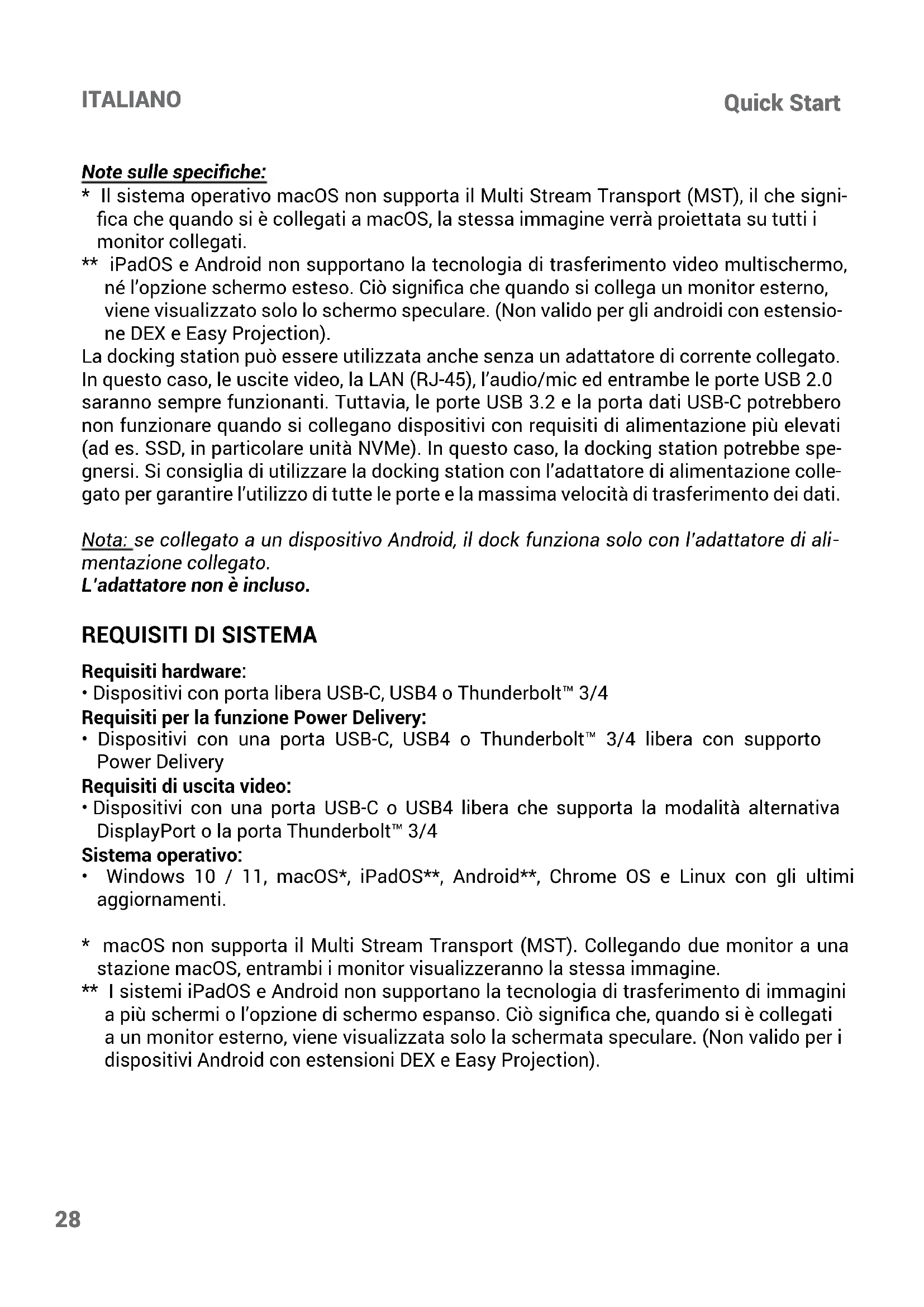 - macOS non supporta il Multi Stream Transport (MST). Collegando due monitor a una stazione macOS, entrambi i monitor visualizzeranno la stessa immagine. ** I sistemi iPadOS e Android non supportano la tecnologia di trasferimento di immagini a più schermi o l’opzione di schermo espanso. Ciò signica che, quando si è collegati a un monitor esterno, viene visualizzata solo la schermata speculare. (Non valido per i dispositivi Android con estensioni DEX e Easy Projection).C31TRIPLE4KDOCKPDPRO