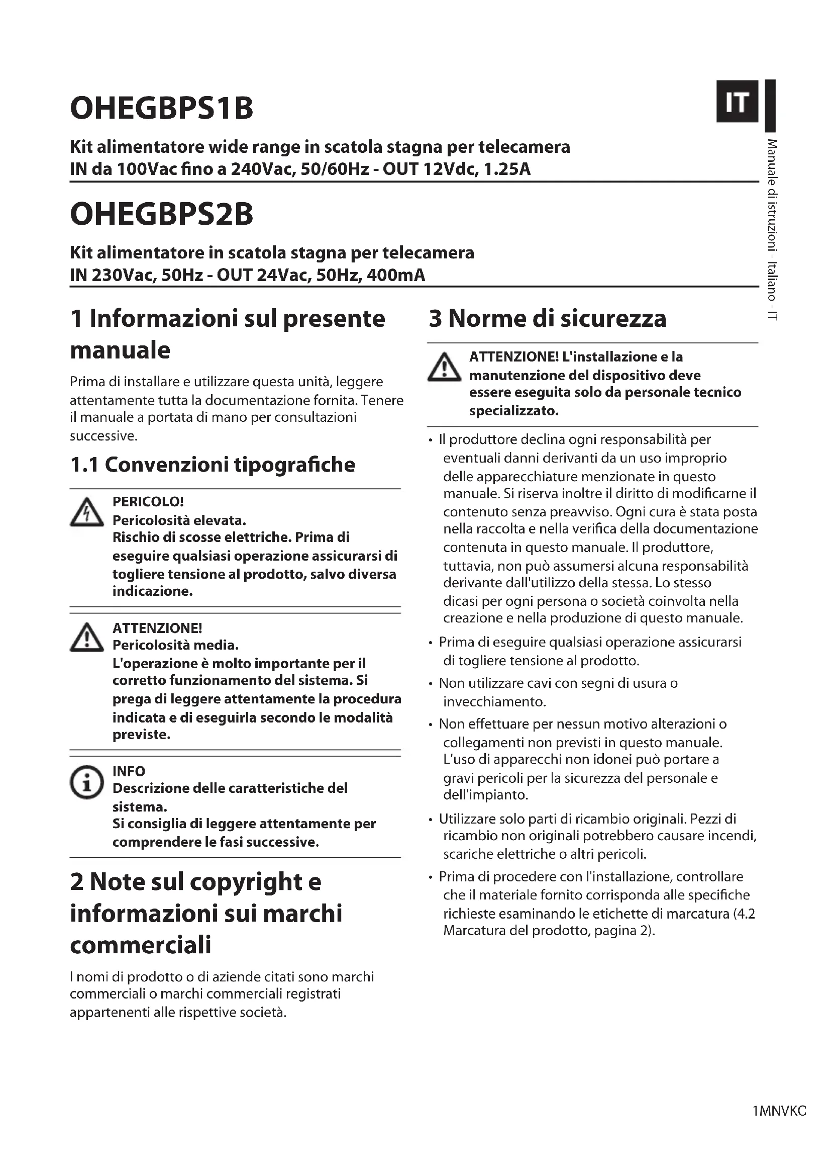 Fig. 1 Vista interna della scatola stagna VIN VOUT Fig. 2 Scheda in dotazione Sezione nominale dei cavi utilizzabili: da 0.5mm² fino a 2.5mm². Chiudere la scatola.IT - Italiano - Manuale di istruzioni 4 MNVKOHEGB_1702_IT 7 Smaltimento dei rifiuti Questo simbolo e il sistema di riciclaggio sono validi solo nei paesi dell'EU e non trovano applicazione in altri paesi del mondo. Il vostro prodotto è costruito con materiali e componenti di alta qualità, che sono riutilizzabili o riciclabili. Prodotti elettrici ed elettronici che riportano questo simbolo, alla fine dell'uso, devono essere smaltiti separatamente dai rifiuti casalinghi. Vi preghiamo di smaltire questo apparecchio in un Centro di raccolta o in un'Ecostazione. Nell'Unione Europea esistono sistemi di raccolta differenziata per prodotti elettrici ed elettronici. Headquarters Italy Videotec s.r.l. Via Friuli, 6 - I-36015 Schio (VI) - Italy Tel. +39 0445 697411 - Fax +39 0445 697414 Email: info@videotec.com www.videotec.comManuel d’instructions - Français - FR 1MNVKOHEGB_1702_FR OHEGBPS1B Kit d'alimentateur wide range en boîtier étanche pour caméra IN de 100Vac jusqu'à 240Vac, 50/60Hz - OUT 12Vdc, 1.25A OHEGBPS2B Kit d'alimentateur en boîtier étanche pour caméra IN 230Vac, 50Hz - OUT 24Vac, 50Hz, 400mA FRANÇAIS 1 À propos de ce mode d’emploi Avant d'installer et d'utiliser cette unité, lire attentivement toute la documentation fournie. Garder le manuel à portée de main pour des consultations successives.