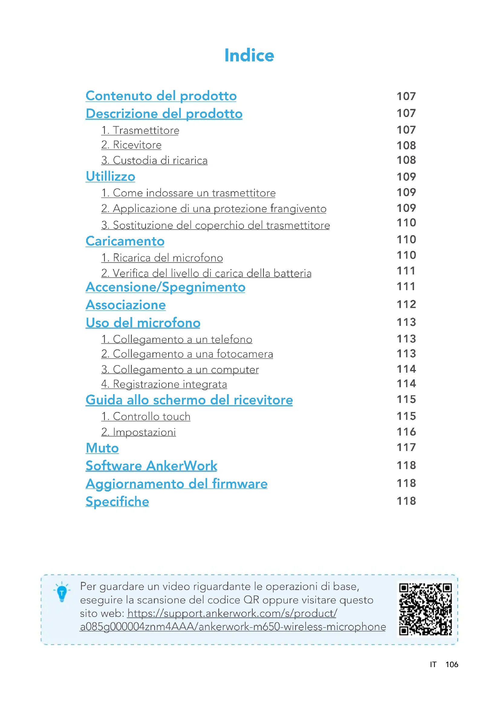 Muto Software AnkerWork Aggiornamento del firmware Specifiche Per guardare un video riguardante le operazioni di base, eseguire la scansione del codice QR oppure visitare questo sito web: https://support.ankerwork.com/s/product/ a085g000004znm4AAA/ankerwork-m650-wireless-microphone Indice