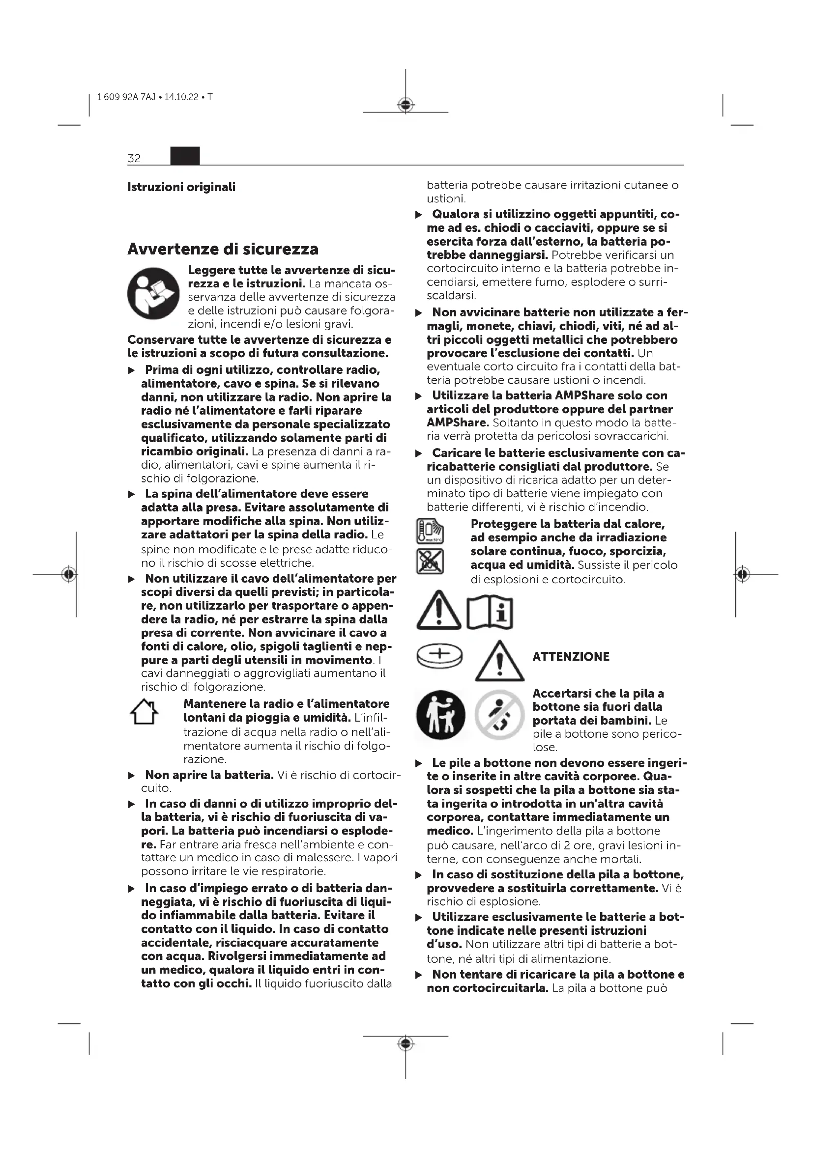 Ulteriori dati tecnici sono disponibili in Internet all’indiriz- zo: https://fein.com/ecodesign Alimentazione della radioItaliano La radio è alimentabile con una batteria al litio(17), oppure tramite l’alimentatore(20). Funzionamento con batteriaItaliano u Utilizzare esclusivamente i caricabatterie indicati nei dati tecnici. Soltanto questi cari- cabatteria sono adatti alle batterie al litio utiliz- zate nella vostra radio. Avvertenza: l’impiego di batterie non idonee alla radio può causare malfunzionamenti o danni alla radio stessa. La batteria al litio è protetta contro la scarica completa dal sistema «Electronic Cell Protection (ECP)». In caso di batteria scarica, la radio viene disattivata da un apposito circuito di protezione. u Non riaccendere la radio dopo che è stata disattivata tramite il circuito di sicurezza. La batteria potrebbe subire danni. Sostituzione della batteriaItaliano Aprire la levetta di bloccaggio(13) della copertu- ra batteria e aprire la copertura(12). Per prelevare la batteria, premere il tasto di sbloccaggio della batteria(16) ed estrarre la bat- teria dal relativo vano. Durante tale operazione, non esercitare forza. Per introdurre la batteria, spingerla nel relativo alloggiamento(14), in modo che i collegamenti della batteria poggino su quelli dell’alloggiamen- to. Far scattare in posizione la batteria. Richiudere la copertura batteria(12) e bloccarla. Indicatore del livello di carica della batteriaItaliano Con la batteria inserita, il livello di carica della batteria(17) è visibile sul display; con la batteria rimossa, sulla batteria stessa. Indicatore del livello di carica della batteria sul displayItaliano L’indicatore del livello di carica della batteria(i) compare sul display non appena viene introdotta una batteria con tensione sufficiente e la radio non è collegata alla rete elettrica tramite l’alimentatore(20). Indicazione Capacità 80−100% 60−80% 40−60% 20−40% 5−20% 0−5% Indicatore del livello di carica della batteria sulla batteriaItaliano Quando la batteria viene rimossa dalla radio, è possibile visualizzare il livello di carica mediante i LED verdi dell’apposito indicatore, sulla batteria stessa. Per visualizzare il livello di carica, premere il tasto oppure dell’apposito indicatore. Se, premendo il tasto dell’indicatore livello di ca- rica della batteria, non si accende alcun LED, la batteria è difettosa e deve essere sostituita. Tipo di batteria GBA 18V...Italiano LED Autonomia Luce fissa, 3 LED verdi 60−100% Luce fissa, 2 LED verdi 30−60% Luce fissa, 1 LED verde 5−30% 34 it 1 609 92A 7AJ • 14.10.22 • TLED Autonomia Luce lampeggiante, 1 LED verde 0−5% Tipo di batteria ProCORE18V...Italiano LED Autonomia Luce fissa, 5 LED verde 80−100 % Luce fissa, 4 LED verde 60−80 % Luce fissa, 3 LED verdi 40−60 % Luce fissa, 2 LED verdi 20−40 % Luce fissa, 1 LED verde 5−20 % Luce lampeggiante, 1 LED verde 0−5 % Funzionamento con alimentatore (vedereFig.A)Italiano u Utilizzare esclusivamente gli alimentatori indicati nei dati tecnici. Soltanto in questo modo sarà possibile un corretto funzionamen- to della radio. u Attenersi alla tensione di rete. La tensione riportata sulla targhetta identificativa dell’ali- mentatore deve corrispondere a quella della sorgente di alimentazione. Aprire la calotta di protezione dello scomparto collegamenti(15). Innestare il connettore(21) dell’alimentatore nella presa di collegamento(22) (DCIN18V). Collegare l’ali- mentatore alla rete elettrica. Per proteggerlo dalle contaminazioni, richiudere la calotta di protezione dello scomparto collegamenti(15), qualora si rimuova il connettore(21). Sostituzione della pila a bottoneItaliano Per poter memorizzare l’ora ed effettuare altre impostazioni sulla radio, è necessario inserire una pila a bottone come batteria tampone. Prima della messa in funzione iniziale della radio, rimuovere la striscia protettiva dalla pila a botto- ne inserita. Aprire la levetta di bloccaggio(13) della copertu- ra batteria e aprire la copertura(12). All’occorrenza, prelevare la batteria(17). Estrarre la striscia protettiva sotto la copertura(18) della pila a bottone. Sostituire la pila a bottone, nel caso l’ora non venga più memorizzata nella radio e l’indicatore cali d’intensità. A tale scopo, ruotare la copertura(18) della pila a bottone in senso antiorario (ad es. utilizzando una moneta) e rimuovere la copertura. Introdurre una nuova pila a bottone. Durante tale fase, prestare attenzione alla corret- ta polarità, riportata sul lato interno della copertura(18). Riapplicare la copertura(18) della pila a bottone e avvitarla saldamente in senso orario. La coper- tura è bloccata in modo sicuro soltanto se le marcature sulla copertura stessa e sul simbolo del lucchetto coincidono. u Rimuovere la pila a bottone dalla radio, se non la si utilizza per lunghi periodi. Se la- sciata a lungo all’interno della radio, la pila a bottone potrebbe corrodersi e autoscaricarsi. UtilizzoItaliano u Proteggere la radio dal contatto diretto con l’acqua. L’infiltrazione di acqua nella radio aumenta il rischio di folgorazione. u Mantenere quanto più possibile chiuse la copertura batteria e la calotta di protezio- ne dello scomparto collegamenti. Le coper- ture chiuse proteggono la radio da acqua e polvere. Modalità AudioItaliano Accensione/spegnimentoItaliano Per accendere la radio, premere il pulsante di accensione/spegnimento(2). Il display(1) si atti- verà e verrà riprodotta la sorgente audio impo- stata all’ultimo spegnimento della radio. A ogni pressione su un tasto, il display(1) si illu- minerà per alcuni secondi. Per spegnere la radio, premere nuovamente il pulsante di accensione/spegnimento(2). Viene memorizzata l’impostazione attuale della sor- gente audio. Regolazione del volumeItaliano All’accensione della radio, il volume è sempre impostato su un valore basso. Per aumentare il volume, ruotare il pulsante di accensio