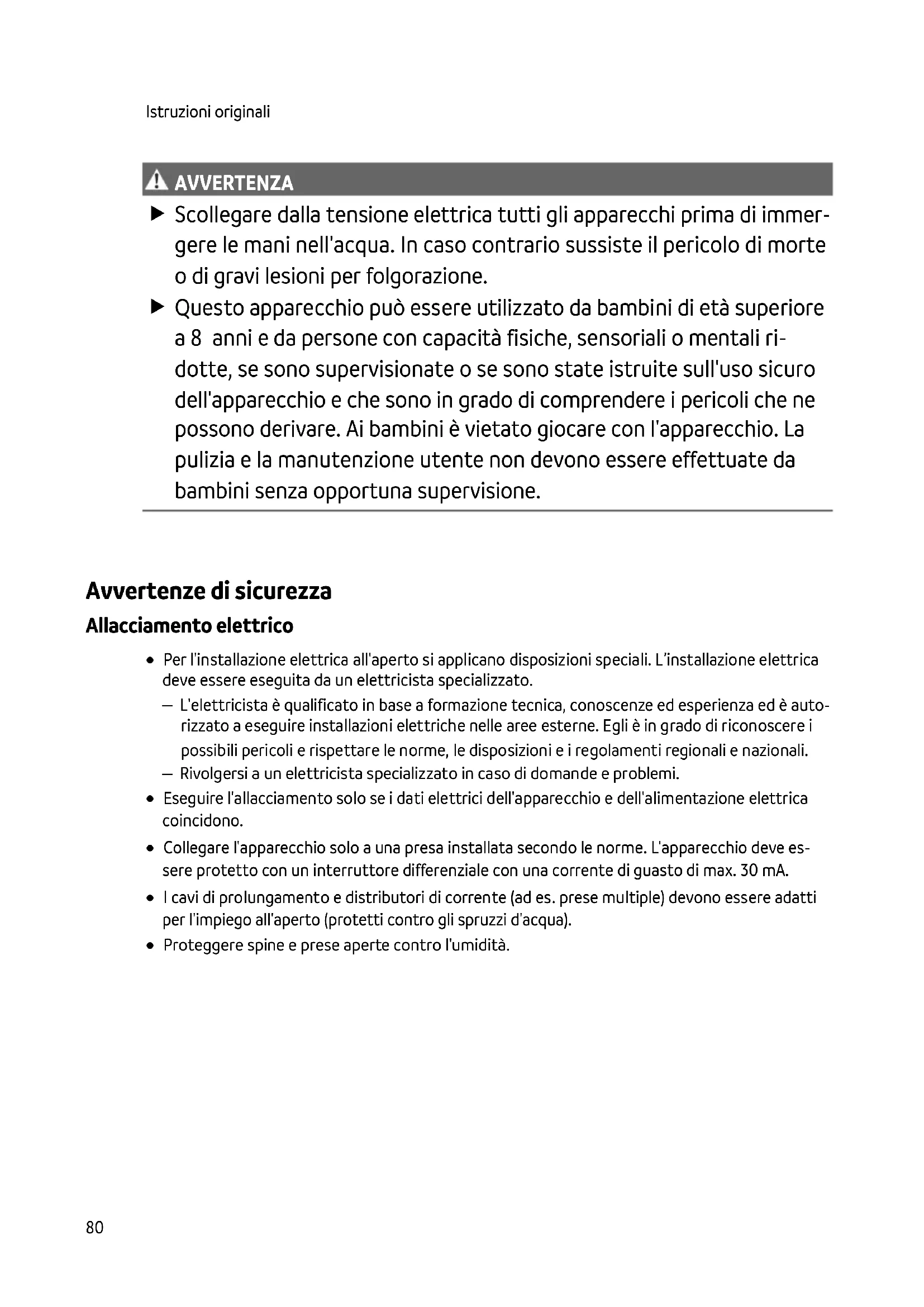 AVVI SO AVVERTENZA Scollegare dalla tensione elettrica tutti gli apparecchi prima di immer- gere le mani nell'acqua. In caso contrario sussiste il pericolo di morte o di gravi lesioni per folgorazione. Questo apparecchio può essere utilizzato da bambini di età superiore a 8 anni e da persone con capacità fisiche, sensoriali o mentali ri- dotte, se sono supervisionate o se sono state istruite sull'uso sicuro dell'apparecchio e che sono in grado di comprendere i pericoli che ne possono derivare. Ai bambini è vietato giocare con l'apparecchio. La pulizia e la manutenzione utente non devono essere effettuate da bambini senza opportuna supervisione.