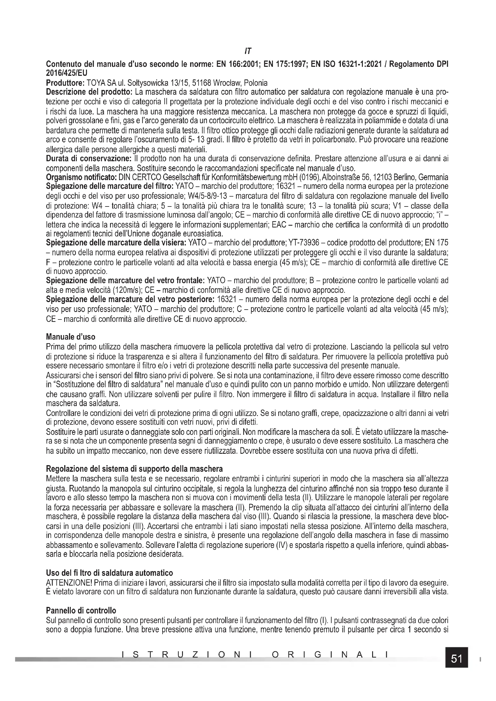 ISTRUZIONI ORIGINALI Contenuto del manuale d’uso secondo le norme: EN 166:2001; EN 175:1997; EN ISO 16321-1:2021 / Regolamento DPI 2016/425/EU Produttore: TOYA SA ul. Sołtysowicka 13/15, 51168 Wrocław, Polonia Descrizione del prodotto: La maschera da saldatura con fi ltro automatico per saldatura con regolazione manuale è una pro- tezione per occhi e viso di categoria II progettata per la protezione individuale degli occhi e del viso contro i rischi meccanici e i rischi da luce. La maschera ha una maggiore resistenza meccanica. La maschera non protegge da gocce e spruzzi di liquidi, polveri grossolane e fi ni, gas e l’arco generato da un cortocircuito elettrico. La maschera è realizzata in poliammide e dotata di una bardatura che permette di mantenerla sulla testa. Il fi ltro ottico protegge gli occhi dalle radiazioni generate durante la saldatura ad arco e consente di regolare l’oscuramento di 5- 13 gradi. Il fi ltro è protetto da vetri in policarbonato. Può provocare una reazione allergica dalle persone allergiche a questi materiali. Durata di conservazione: Il prodotto non ha una durata di conservazione defi nita. Prestare attenzione all’usura e ai danni ai componenti della maschera. Sostituire secondo le raccomandazioni specifi cate nel manuale d’uso. Organismo notifi cato: DIN CERTCO Gesellschaft für Konformitätsbewertung mbH (0196), Alboinstraße 56, 12103 Berlino, Germania Spiegazione delle marcature del fi ltro: YATO – marchio del produttore; 16321 – numero della norma europea per la protezione degli occhi e del viso per uso professionale; W4/5-8/9-13 – marcatura del fi ltro di saldatura con regolazione manuale del livello di protezione: W4 – tonalità chiara; 5 – la tonalità più chiara tra le tonalità scure; 13 – la tonalità più scura; V1 – classe della dipendenza del fattore di trasmissione luminosa dall’angolo; CE – marchio di conformità alle direttive CE di nuovo approccio; “i” – lettera che indica la necessità di leggere le informazioni supplementari; EAC – marchio che certifi ca la conformità di un prodotto ai regolamenti tecnici dell’Unione doganale euroasiatica. Spiegazione delle marcature della visiera: YATO – marchio del produttore; YT-73936 – codice prodotto del produttore; EN 175 – numero della norma europea relativa ai dispositivi di protezione utilizzati per proteggere gli occhi e il viso durante la saldatura; F – protezione contro le particelle volanti ad alta velocità e bassa energia (45 m/s); CE – marchio di conformità alle direttive CE di nuovo approccio. Spiegazione delle marcature del vetro frontale: YATO – marchio del produttore; B – protezione contro le particelle volanti ad alta e media velocità (120m/s); CE – marchio di conformità alle direttive CE di nuovo approccio. Spiegazione delle marcature del vetro posteriore: 16321 – numero della norma europea per la protezione degli occhi e del viso per uso professionale; YATO – marchio del produttore; C – protezione contro le particelle volanti ad alta velocità (45 m/s); CE – marchio di conformità alle direttive CE di nuovo approccio. Manuale d’uso Prima del primo utilizzo della maschera rimuovere la pellicola protettiva dal vetro di protezione. Lasciando la pellicola sul vetro di protezione si riduce la trasparenza e si altera il funzionamento del fi ltro di saldatura. Per rimuovere la pellicola protettiva può essere necessario smontare il fi ltro e/o i vetri di protezione descritti nella parte successiva del presente manuale. Assicurarsi che i sensori del fi ltro siano privi di polvere. Se si nota una contaminazione, il fi ltro deve essere rimosso come descritto in “Sostituzione del fi ltro di saldatura” nel manuale d’uso e quindi pulito con un panno morbido e umido. Non utilizzare detergenti che causano graffi . Non utilizzare solventi per pulire il fi ltro. Non immergere il fi ltro di saldatura in acqua. Installare il fi ltro nella maschera da saldatura. Controllare le condizioni dei vetri di protezione prima di ogni utilizzo. Se si notano graffi , crepe, opacizzazione o altri danni ai vetri di protezione, devono essere sostituiti con vetri nuovi, privi di difetti. Sostituire le parti usurate o danneggiate solo con parti originali. Non modifi care la maschera da soli. È vietato utilizzare la masche- ra se si nota che un componente presenta segni di danneggiamento o crepe, è usurato o deve essere sostituito. La maschera che ha subito un impatto meccanico, non deve essere riutilizzata. Dovrebbe essere sostituita con una nuova priva di difetti. Regolazione del sistema di supporto della maschera Mettere la maschera sulla testa e se necessario, regolare entrambi i cinturini superiori in modo che la maschera sia all’altezza giusta. Ruotando la manopola sul cinturino occipitale, si regola la lunghezza del cinturino affi nché non sia troppo teso durante il lavoro e allo stesso tempo la maschera non si muova con i movimenti della testa (II). Utilizzare le manopole laterali per regolare la forza necessaria per abbassare e sollevare la maschera (II). Premendo la clip situata all’attacco dei cinturini all’interno della maschera, è possibile regolare la distanza della maschera dal viso (III). Quando si rilascia la pressione, la maschera deve bloc- carsi in una delle posizioni (III). Accertarsi che entrambi i lati siano impostati nella stessa posizione. All’interno della maschera, in corrispondenza delle manopole destra e sinistra, è presente una regolazione dell’angolo della maschera in fase di massimo abbassamento e sollevamento. Sollevare l’aletta di regolazione superiore (IV) e spostarla rispetto a quella inferiore, quindi abbas- sarla e bloccarla nella posizione desiderata. Uso del fi ltro di saldatura automatico ATTENZIONE! Prima di iniziare i lavori, assicurarsi che il fi ltro sia impostato sulla modalità corretta per il tipo di lavoro da eseguire. È vietato lavorare con un fi ltro di saldatura non funzion