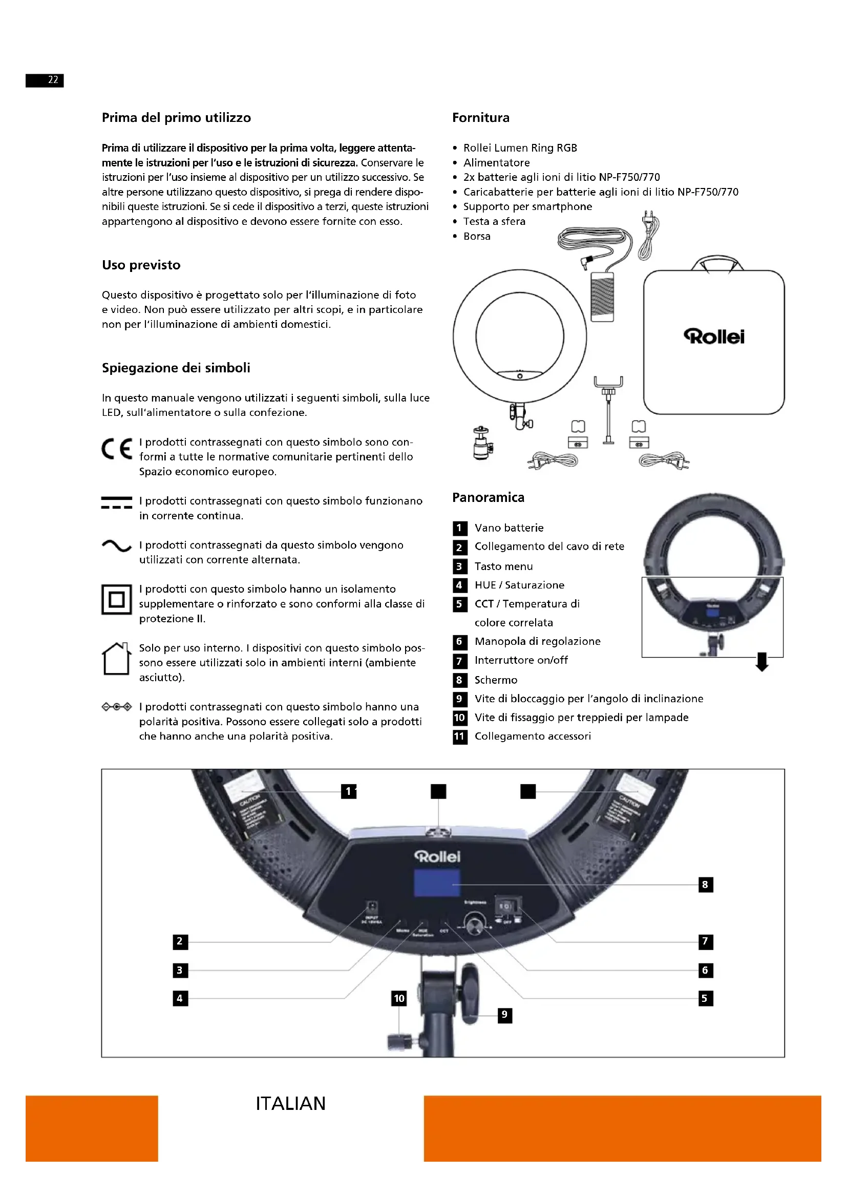 Prima del primo utilizzo Prima di utilizzare il dispositivo per la prima volta, leggere attenta- mente le istruzioni per l‘uso e le istruzioni di sicurezza. Conservare le istruzioni per l‘uso insieme al dispositivo per un utilizzo successivo. Se altre persone utilizzano questo dispositivo, si prega di rendere dispo- nibili queste istruzioni. Se si cede il dispositivo a terzi, queste istruzioni appartengono al dispositivo e devono essere fornite con esso. Uso previsto Questo dispositivo è progettato solo per l‘illuminazione di foto e video. Non può essere utilizzato per altri scopi, e in particolare non per l‘illuminazione di ambienti domestici. Spiegazione dei simboli In questo manuale vengono utilizzati i seguenti simboli, sulla luce LED, sull‘alimentatore o sulla confezione. I prodotti contrassegnati con questo simbolo sono con- formi a tutte le normative comunitarie pertinenti dello Spazio economico europeo. I prodotti contrassegnati con questo simbolo funzionano in corrente continua. I prodotti contrassegnati da questo simbolo vengono utilizzati con corrente alternata. I prodotti con questo simbolo hanno un isolamento supplementare o rinforzato e sono conformi alla classe di protezione II. Solo per uso interno. I dispositivi con questo simbolo pos- sono essere utilizzati solo in ambienti interni (ambiente asciutto). I prodotti contrassegnati con questo simbolo hanno una polarità positiva. Possono essere collegati solo a prodotti che hanno anche una polarità positiva. Fornitura