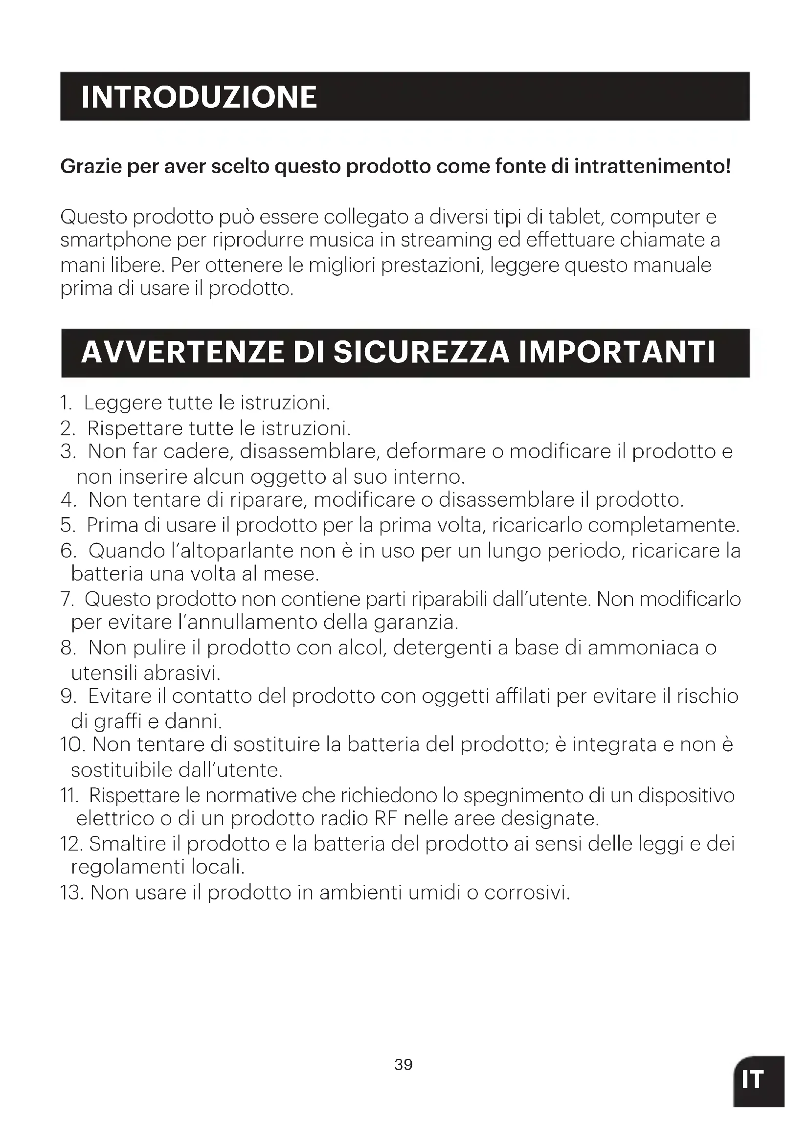 Grazie per aver scelto questo prodotto come fonte di intrattenimento! Questo prodotto può essere collegato a diversi tipi di tablet, computer e smartphone per riprodurre musica in streaming ed eettuare chiamate a mani libere. Per ottenere le migliori prestazioni, leggere questo manuale prima di usare il prodotto.40