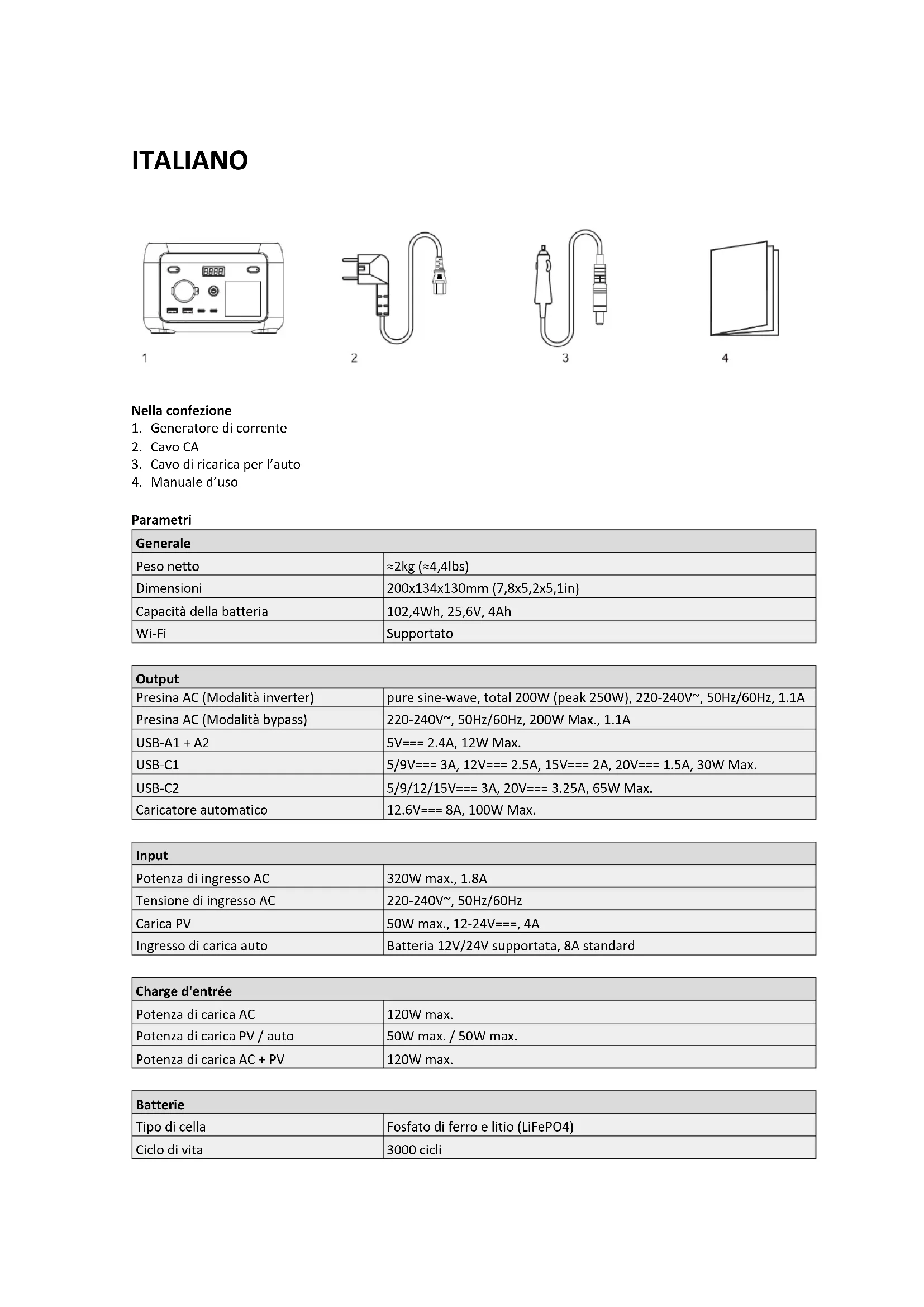 Input Potenza di ingresso AC 320W max., 1.8A Tensione di ingresso AC 220-240V~, 50Hz/60Hz Carica PV 50W max., 12-24V===, 4A Ingresso di carica auto Batteria 12V/24V supportata, 8A standard