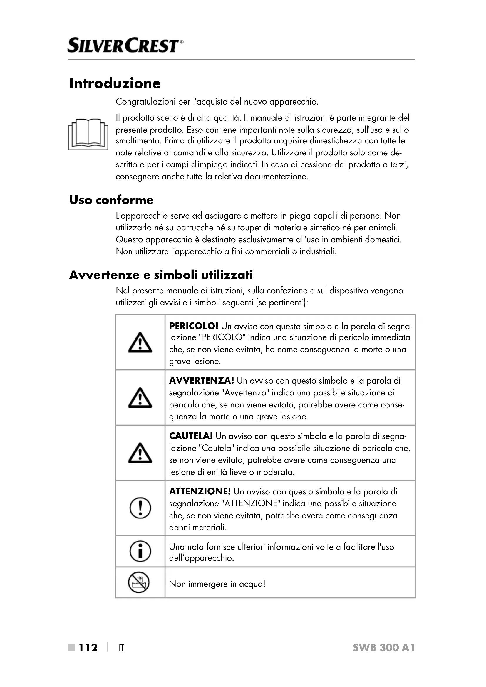 IT SWB 300 A1 Introduzione Congratulazioni per l'acquisto del nuovo apparecchio. Il prodotto scelto è di alta qualità. Il manuale di istruzioni è parte integrante del presente prodotto. Esso contiene importanti note sulla sicurezza, sull'uso e sullo smaltimento. Prima di utilizzare il prodotto acquisire dimestichezza con tutte le note relative ai comandi e alla sicurezza. Utilizzare il prodotto solo come de- scritto e per i campi d'impiego indicati. In caso di cessione del prodotto a terzi, consegnare anche tutta la relativa documentazione. Uso conforme L'apparecchio serve ad asciugare e mettere in piega capelli di persone. Non utilizzarlo né su parrucche né su toupet di materiale sintetico né per animali. Questo apparecchio è destinato esclusivamente all'uso in ambienti domestici. Non utilizzare l'apparecchio a fini commerciali o industriali. Avvertenze e simboli utilizzati Nel presente manuale di istruzioni, sulla confezione e sul dispositivo vengono utilizzati gli avvisi e i simboli seguenti (se pertinenti): PERICOLO! Un avviso con questo simbolo e la parola di segna- lazione "PERICOLO" indica una situazione di pericolo immediata che, se non viene evitata, ha come conseguenza la morte o una grave lesione. AVVERTENZA! Un avviso con questo simbolo e la parola di segnalazione "Avvertenza" indica una possibile situazione di pericolo che, se non viene evitata, potrebbe avere come conse- guenza la morte o una grave lesione. CAUTELA! Un avviso con questo simbolo e la parola di segna- lazione "Cautela" indica una possibile situazione di pericolo che, se non viene evitata, potrebbe avere come conseguenza una lesione di entità lieve o moderata. ATTENZIONE! Un avviso con questo simbolo e la parola di segnalazione "ATTENZIONE" indica una possibile situazione che, se non viene evitata, potrebbe avere come conseguenza danni materiali. Una nota fornisce ulteriori informazioni volte a facilitare l'uso dell’apparecchio. Non immergere in acqua!IT