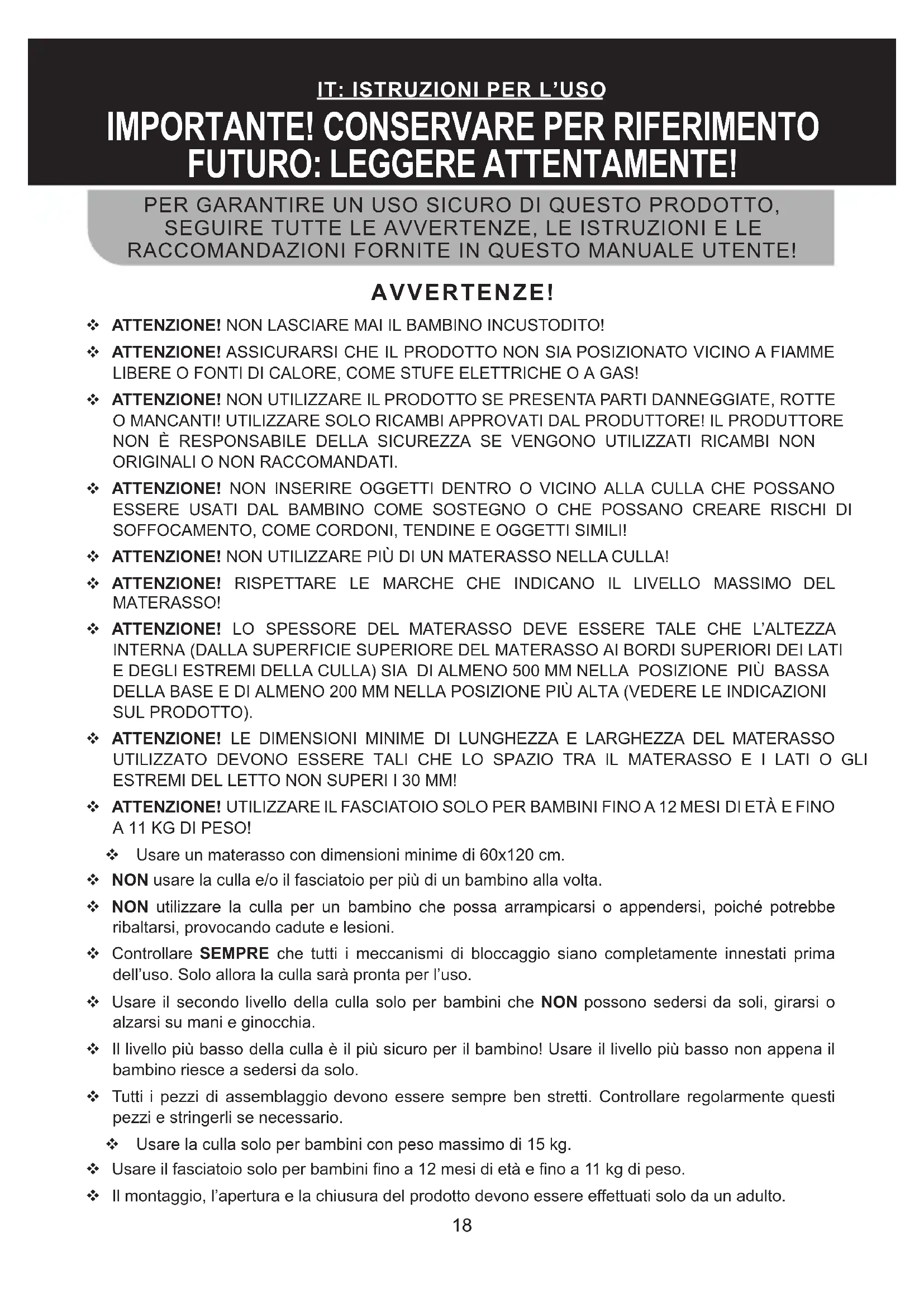 NON utilise la culla per un bambino che possa arrampicarsi o appendersi, poiché potrebberibaltarsi, provocando cadute e lesioni.