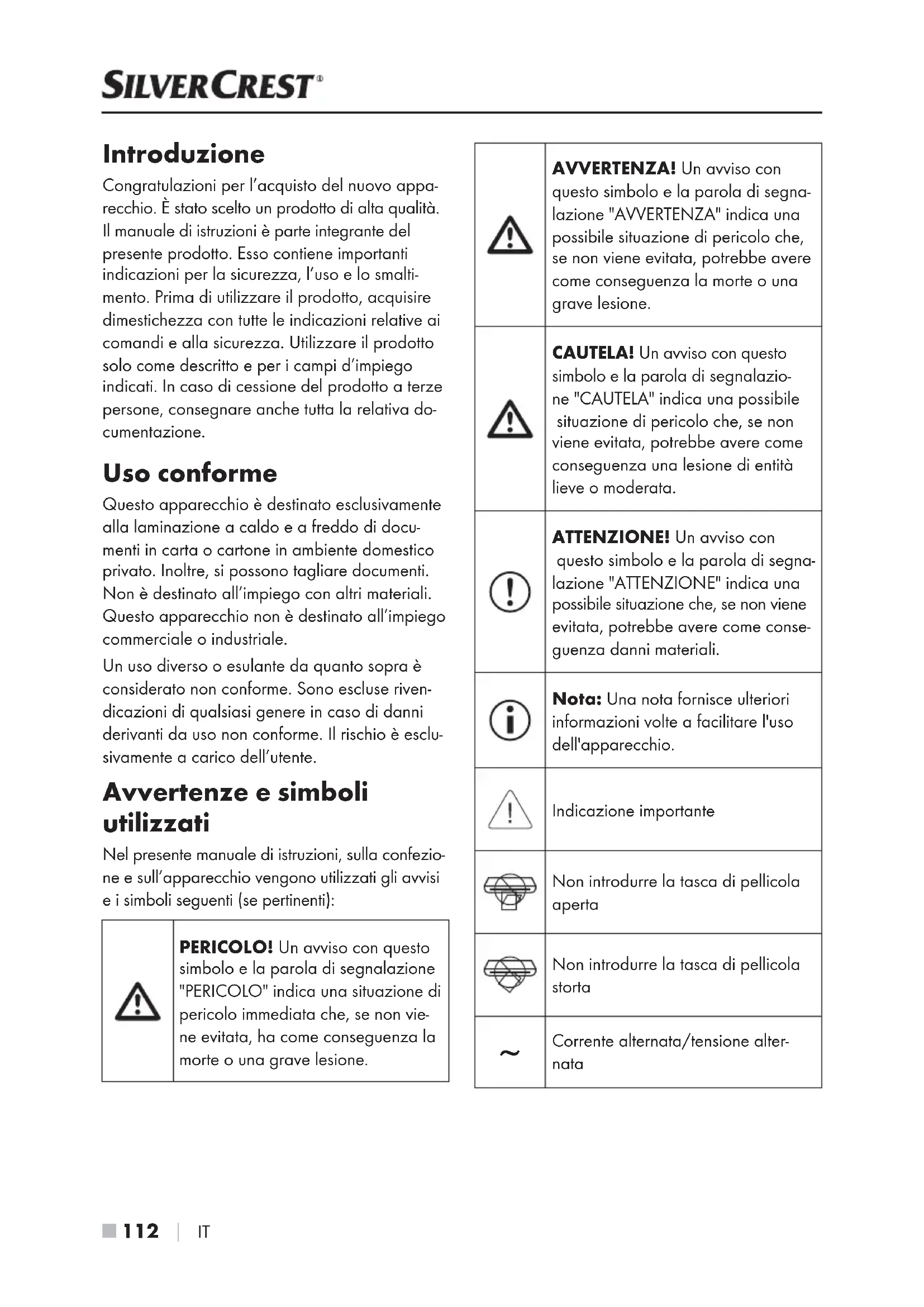 IT Introduzione Congratulazioni per l’acquisto del nuovo appa- recchio. È stato scelto un prodotto di alta qualità. Il manuale di istruzioni è parte integrante del presente prodotto. Esso contiene importanti indicazioni per la sicurezza, l’uso e lo smalti- mento. Prima di utilizzare il prodotto, acquisire dimestichezza con tutte le indicazioni relative ai comandi e alla sicurezza. Utilizzare il prodotto solo come descritto e per i campi d’impiego indicati. In caso di cessione del prodotto a terze persone, consegnare anche tutta la relativa do- cumentazione. Uso conforme Questo apparecchio è destinato esclusivamente alla laminazione a caldo e a freddo di docu- menti in carta o cartone in ambiente domestico privato. Inoltre, si possono tagliare documenti. Non è destinato all’impiego con altri materiali. Questo apparecchio non è destinato all’impiego commerciale o industriale. Un uso diverso o esulante da quanto sopra è considerato non conforme. Sono escluse riven- dicazioni di qualsiasi genere in caso di danni derivanti da uso non conforme. Il rischio è esclu- sivamente a carico dell’utente. Avvertenze e simboli utilizzati Nel presente manuale di istruzioni, sulla confezio- ne e sull’apparecchio vengono utilizzati gli avvisi e i simboli seguenti (se pertinenti): PERICOLO! Un avviso con questo simbolo e la parola di segnalazione "PERICOLO" indica una situazione di pericolo immediata che, se non vie- ne evitata, ha come conseguenza la morte o una grave lesione. AVVERTENZA! Un avviso con questo simbolo e la parola di segna- lazione "AVVERTENZA" indica una possibile situazione di pericolo che, se non viene evitata, potrebbe avere come conseguenza la morte o una grave lesione. CAUTELA! Un avviso con questo simbolo e la parola di segnalazio- ne "CAUTELA" indica una possibile situazione di pericolo che, se non viene evitata, potrebbe avere come conseguenza una lesione di entità lieve o moderata. ATTENZIONE! Un avviso con questo simbolo e la parola di segna- lazione "ATTENZIONE" indica una possibile situazione che, se non viene evitata, potrebbe avere come conse- guenza danni materiali. Nota: Una nota fornisce ulteriori informazioni volte a facilitare l'uso dell'apparecchio. Indicazione importante Non introdurre la tasca di pellicola aperta Non introdurre la tasca di pellicola storta