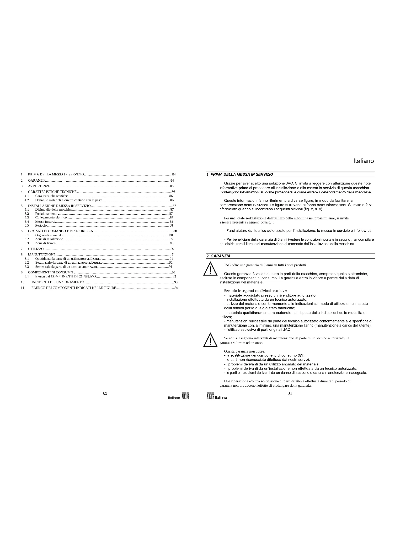 Grazie per aver scelto una soluzione JAC. Si invita a leggere con attenzione queste note informative prima di procedere all'installazione e alla messa in servizio di questa macchina. Contengono informazioni su come proteggersi e come evitare il deterioramento della macchina. Queste informazioni fanno riferimento a diverse figure, in modo da facilitare la comprensione delle istruzioni. Le figure si trovano al fondo delle informazioni. Si invita a farvi riferimento quando si incontrano i seguenti simboli (fig. x, n. y). Per una totale soddisfazione dall'utilizzo della macchina nei prossimi anni, si invita a tenere presenti i seguenti consigli: - Farsi aiutare dal tecnico autorizzato per l'installazione, la messa in servizio e il follow-up. - Per beneficiare della garanzia di 5 anni (vedere le condizioni riportate in seguito), far compilare dal distributore il libretto di manutenzione al momento dell'installazione della macchina. 2 GARANZIA JAC offre una garanzia di 5 anni su tutti i suoi prodotti. Questa garanzia è valida su tutte le parti della macchina, comprese quelle elettroniche, escluse le componenti di consumo. La garanzia entra in vigore a partire dalla data di installazione del materiale. Secondo le seguenti condizioni restrittive: - materiale acquistato presso un rivenditore autorizzato; - installazione effettuata da un tecnico autorizzato; - utilizzo del materiale conformemente alle indicazioni sul modo di utilizzo e nel rispetto della finalità per la quale è stato fabbricato; - materiale quotidianamente manutenuto nel rispetto delle indicazioni delle modalità di utilizzo; - manutenzioni successive da parte del tecnico autorizzato conformemente alle specifiche di manutenzione con, al minimo, una manutenzione l’anno (manutenzione a carico dell’utente); - l’utilizzo esclusivo di parti originali JAC. Se non si eseguono interventi di manutenzione da parte di un tecnico autorizzato, la garanzia si limita ad un anno. Questa garanzia non copre: - la sostituzione dei componenti di consumo (§9); - le parti non riconosciute difettose dai nostri servizi; - i problemi derivanti da un utilizzo anomalo del materiale; - i problemi derivanti da un’installazione non effettuata da un tecnico autorizzato; - le parti o i problemi derivanti da un danno di trasporto o da una manutenzione inadeguata. Una riparazione e/o una sostituzione di parti difettose effettuate durante il periodo di garanzia non producono l'effetto di prolungare detta garanzia.Italiano
