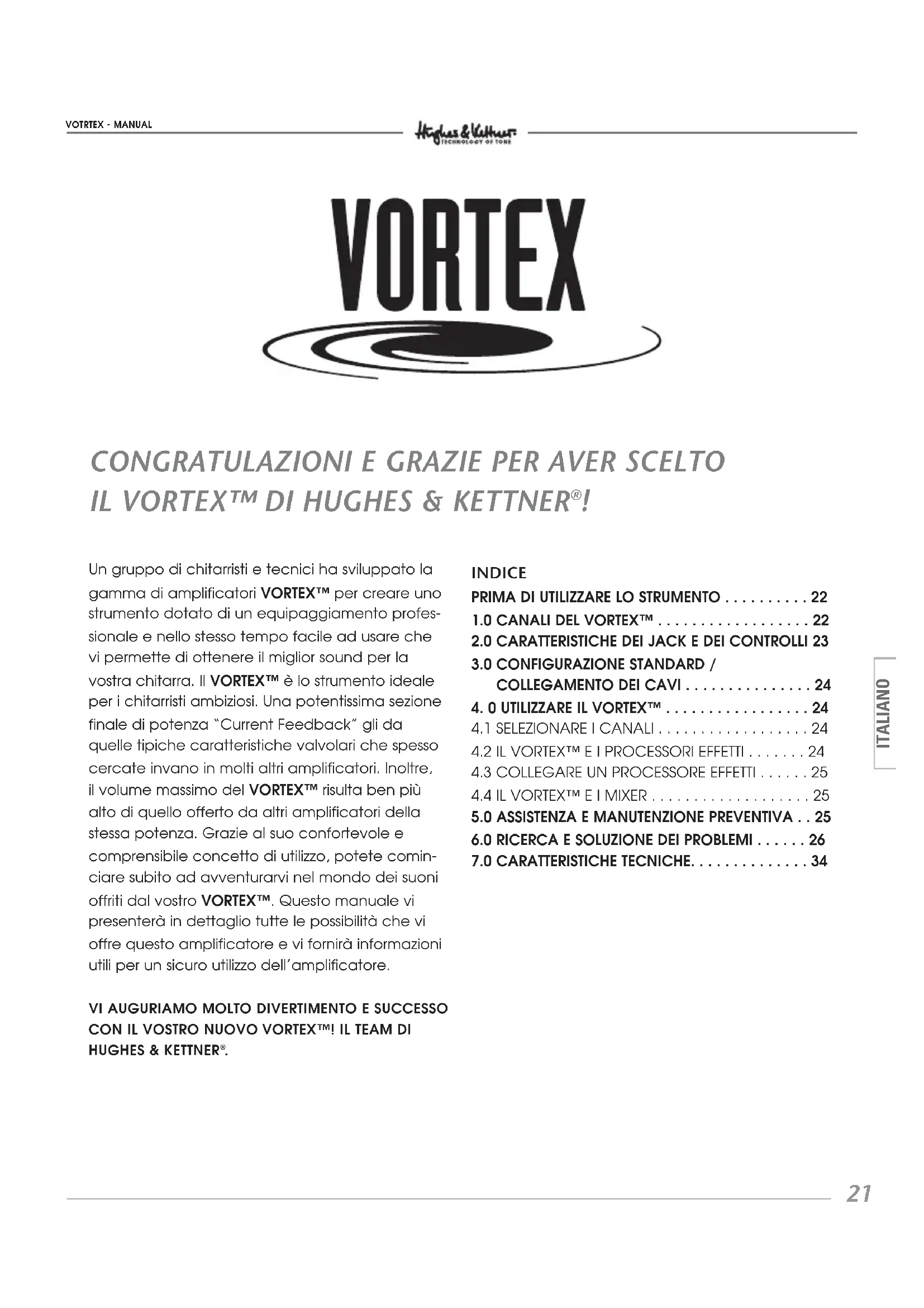 ITALIANO Un gruppo di chitarristi e tecnici ha sviluppato la gamma di amplificatori VORTEX™ per creare uno strumento dotato di un equipaggiamento profes- sionale e nello stesso tempo facile ad usare che vi permette di ottenere il miglior sound per la vostra chitarra. Il VORTEX™ è lo strumento ideale per i chitarristi ambiziosi. Una potentissima sezione finale di potenza “Current Feedback” gli da quelle tipiche caratteristiche valvolari che spesso cercate invano in molti altri amplificatori. Inoltre, il volume massimo del VORTEX™ risulta ben più alto di quello offerto da altri amplificatori della stessa potenza. Grazie al suo confortevole e comprensibile concetto di utilizzo, potete comin- ciare subito ad avventurarvi nel mondo dei suoni offriti dal vostro VORTEX™. Questo manuale vi presenterà in dettaglio tutte le possibilità che vi offre questo amplificatore e vi fornirà informazioni utili per un sicuro utilizzo dell’amplificatore. VI AUGURIAMO MOLTO DIVERTIMENTO E SUCCESSOCON IL VOSTRO NUOVO VORTEX™! IL TEAM DIHUGHES & KETTNER