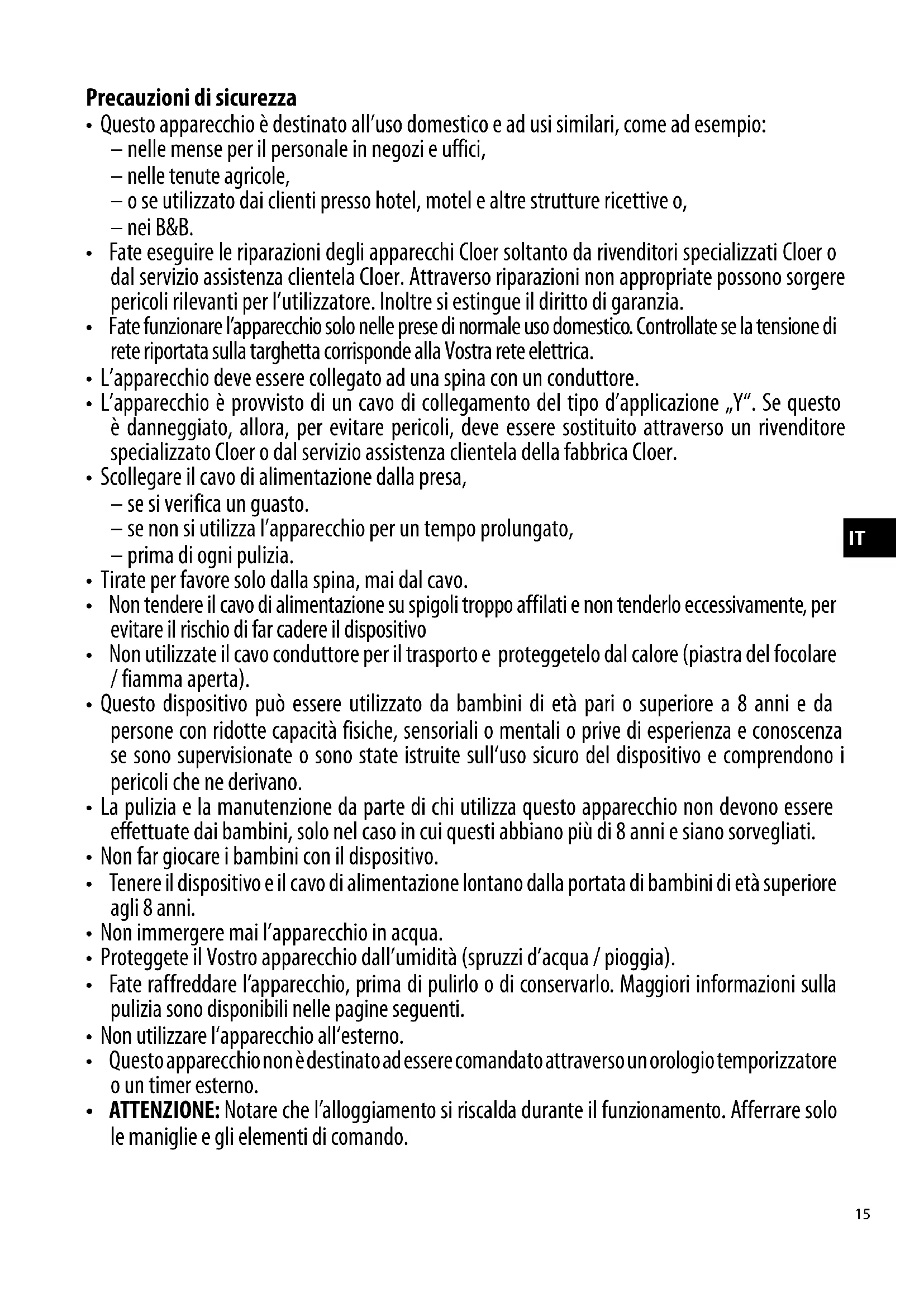 - L’apparecchio è provvisto di un cavo di collegamento del tipo d’applicazione „Y“. Se questo è danneggiato, allora, per evitare pericoli, deve essere sostituito attraverso un rivenditore specializzato Cloer o dal servizio assistenza clientela della fabbrica Cloer.