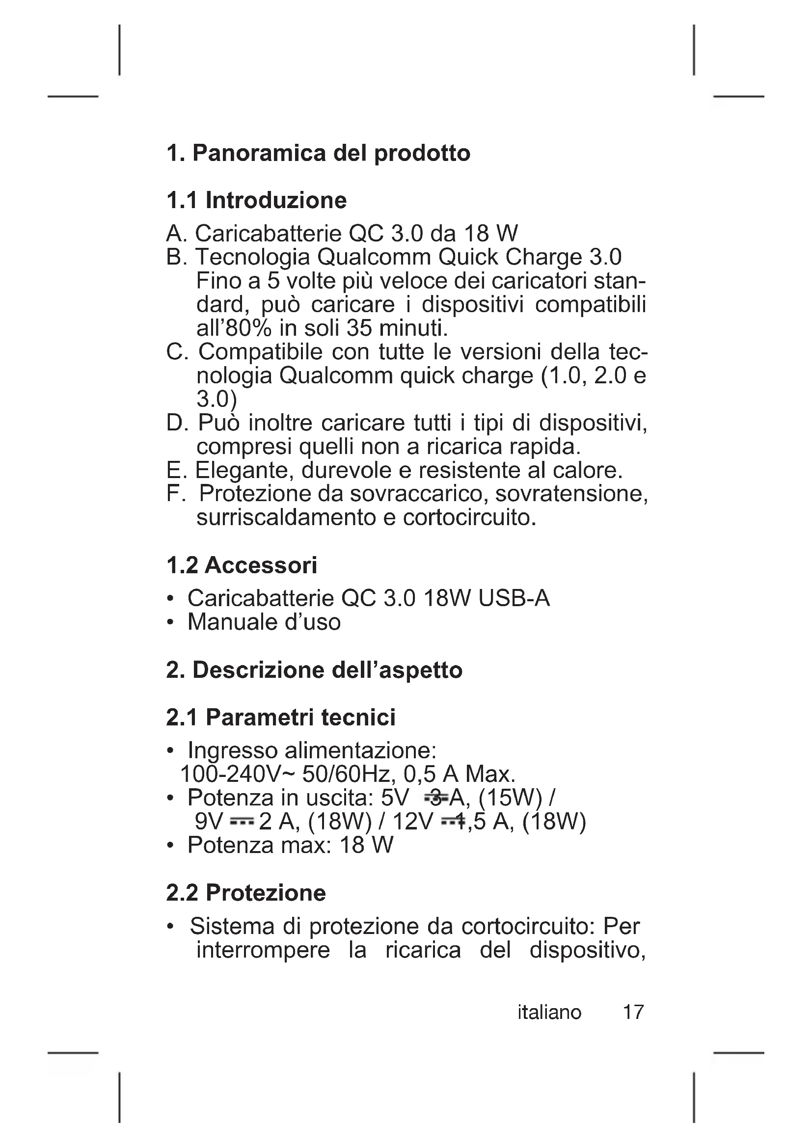 A. Caricabatterie QC 3.0 da 18 W B. Tecnologia Qualcomm Quick Charge 3.0 Fino a 5 volte più veloce dei caricatori stan- dard, può caricare i dispositivi compatibili all’80% in soli 35 minuti. C. Compatibile con tutte le versioni della tec- nologia Qualcomm quick charge (1.0, 2.0 e 3.0) D. Può inoltre caricare tutti i tipi di dispositivi, compresi quelli non a ricarica rapida. E. Elegante, durevole e resistente al calore. F. Protezione da sovraccarico, sovratensione, surriscaldamento e cortocircuito.