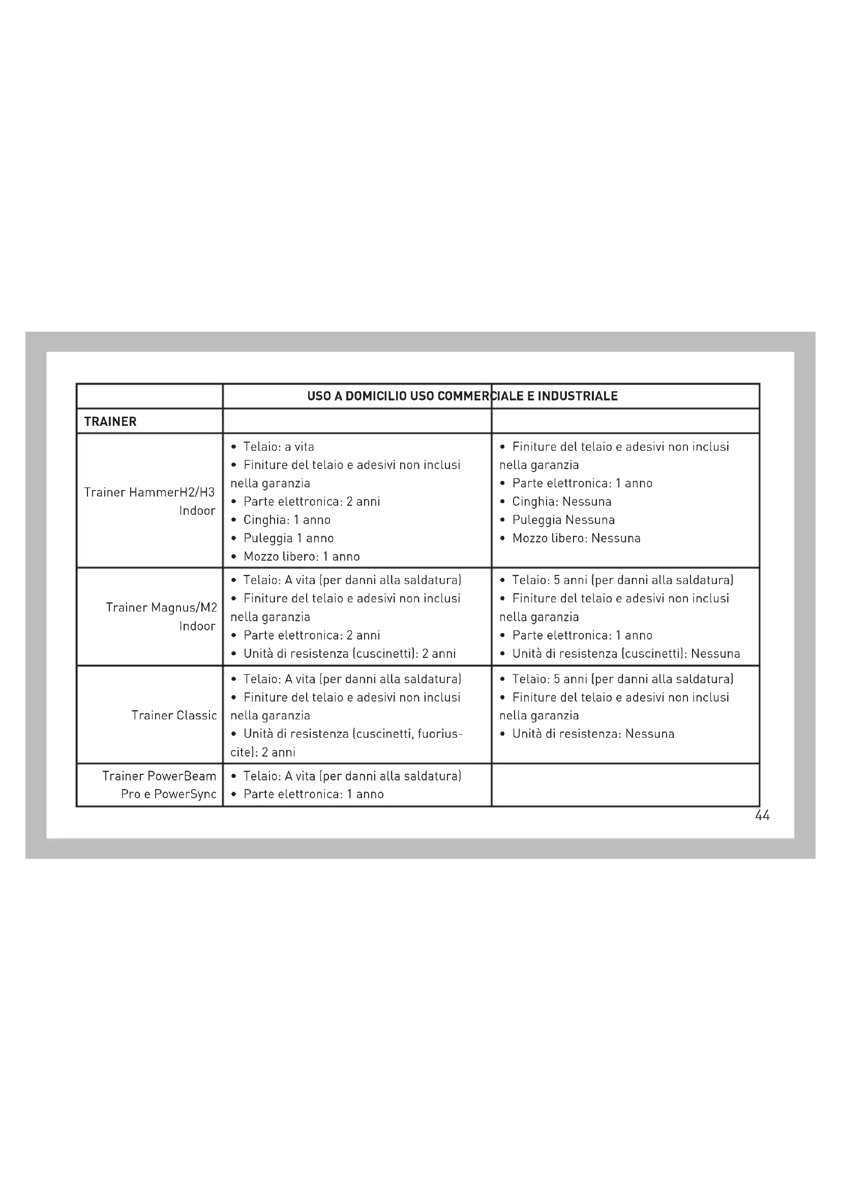 - Unità di resistenza (cuscinetti, fuorius- cite): 2 anni
