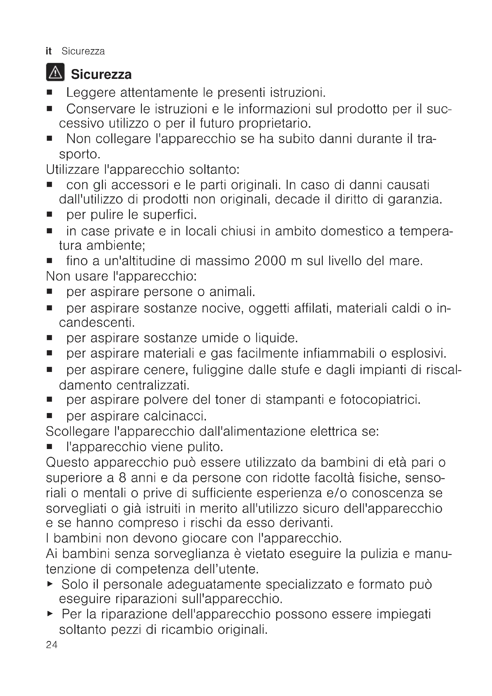 Sicurezza ¡ Leggere attentamente le presenti istruzioni. ¡ Conservare le istruzioni e le informazioni sul prodotto per il suc- cessivo utilizzo o per il futuro proprietario. ¡ Non collegare l'apparecchio se ha subito danni durante il tra- sporto. Utilizzare l'apparecchio soltanto: ¡ con gli accessori e le parti originali. In caso di danni causati dall'utilizzo di prodotti non originali, decade il diritto di garanzia. ¡ per pulire le superfici. ¡ in case private e in locali chiusi in ambito domestico a tempera- tura ambiente; ¡ fino a un'altitudine di massimo 2000m sul livello del mare. Non usare l'apparecchio: ¡ per aspirare persone o animali. ¡ per aspirare sostanze nocive, oggetti affilati, materiali caldi o in- candescenti. ¡ per aspirare sostanze umide o liquide. ¡ per aspirare materiali e gas facilmente infiammabili o esplosivi. ¡ per aspirare cenere, fuliggine dalle stufe e dagli impianti di riscal- damento centralizzati. ¡ per aspirare polvere del toner di stampanti e fotocopiatrici. ¡ per aspirare calcinacci. Scollegare l'apparecchio dall'alimentazione elettrica se: ¡ l'apparecchio viene pulito. Questo apparecchio può essere utilizzato da bambini di età pari o superiore a 8 anni e da persone con ridotte facoltà fisiche, senso- riali o mentali o prive di sufficiente esperienza e/o conoscenza se sorvegliati o già istruiti in merito all'utilizzo sicuro dell'apparecchio e se hanno compreso i rischi da esso derivanti. I bambini non devono giocare con l'apparecchio. Ai bambini senza sorveglianza è vietato eseguire la pulizia e manu- tenzione di competenza dell’utente. ▶ Solo il personale adeguatamente specializzato e formato può eseguire riparazioni sull'apparecchio. ▶ Per la riparazione dell'apparecchio possono essere impiegati soltanto pezzi di ricambio originali.Sicurezza it