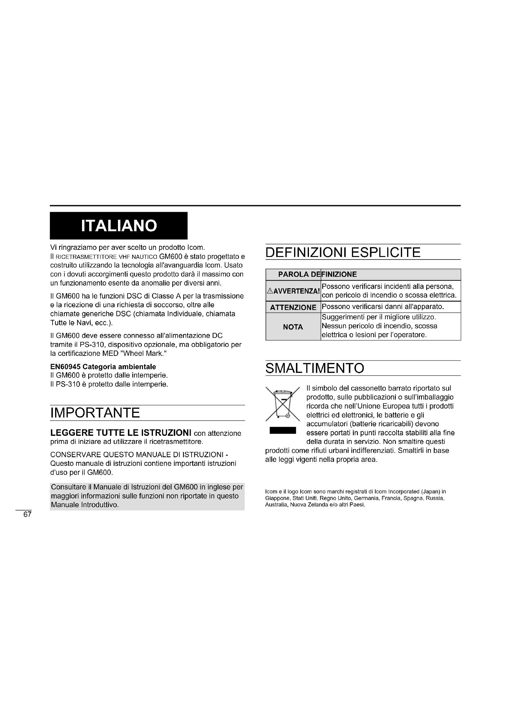 Questo manuale di istruzioni contiene importanti istruzioni d'uso per il GM600. Icom e il logo Icom sono marchi registrati di Icom Incorporated (Japan) in Giappone, Stati Uniti, Regno Unito, Germania, Francia, Spagna, Russia, Australia, Nuova Zelanda e/o altri Paesi. Consultare il Manuale di Istruzioni del GM600 in inglese per maggiori informazioni sulle funzioni non riportate in questo Manuale Introduttivo. DEFINIZIONI ESPLICITE PAROLA DEFINIZIONE RAVVERTENZA! Possono vericarsi incidenti alla persona, con pericolo di incendio o scossa elettrica. ATTENZIONE Possono vericarsi danni all'apparato. NOTA Suggerimenti per il migliore utilizzo. Nessun pericolo di incendio, scossa elettrica o lesioni per l’operatore. SMALTIMENTO Il simbolo del cassonetto barrato riportato sul prodotto, sulle pubblicazioni o sull’imballaggio ricorda che nell’Unione Europea tutti i prodotti elettrici ed elettronici, le batterie e gli accumulatori (batterie ricaricabili) devono essere portati in punti raccolta stabiliti alla ne della durata in servizio. Non smaltire questi prodotti come riuti urbani indifferenziati. Smaltirli in base alle leggi vigenti nella propria area.