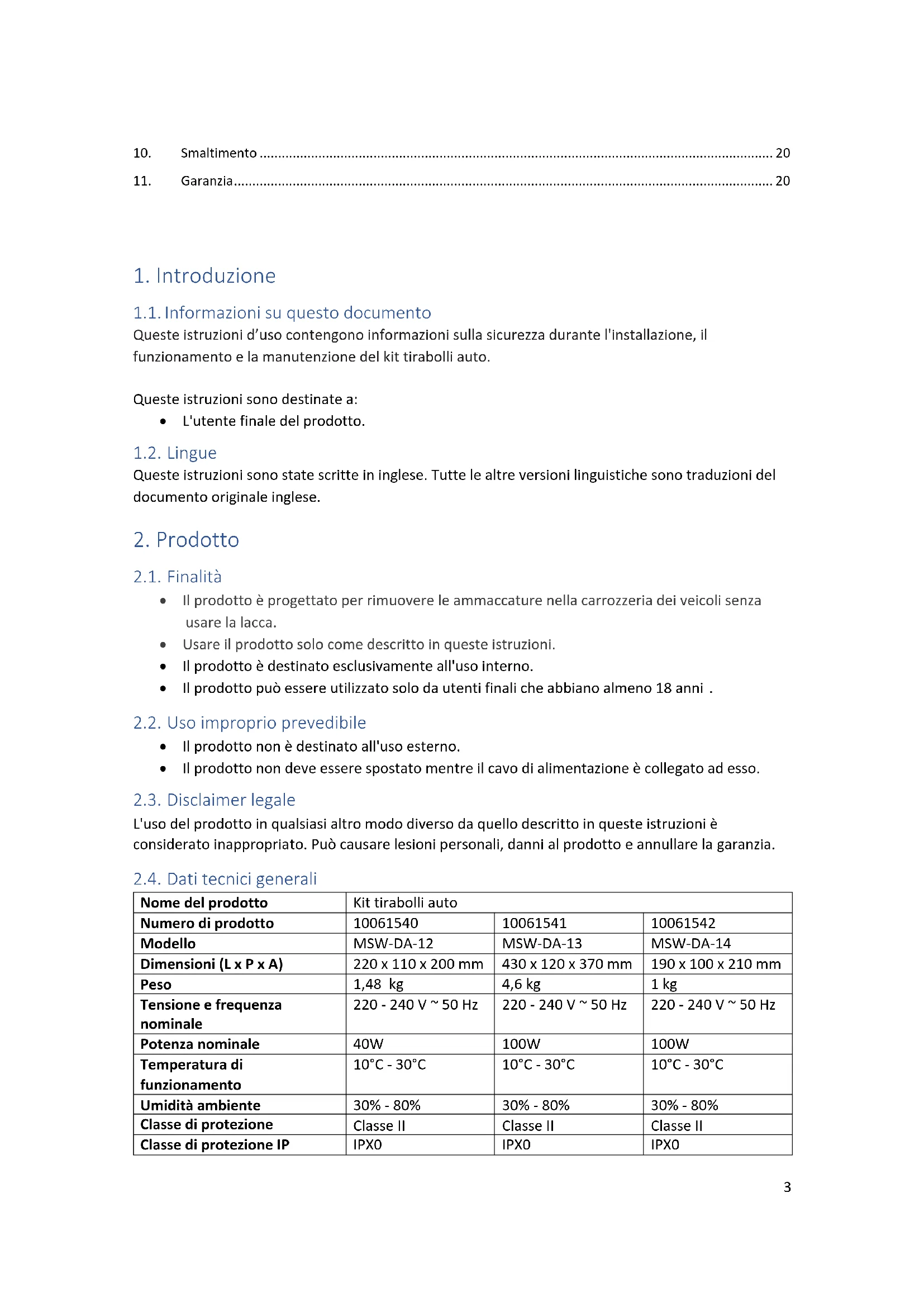 - Il prodotto non deve essere spostato mentre il cavo di alimentazione è collegato ad esso. 2.3. Disclaimer legale L'uso del prodotto in qualsiasi altro modo diverso da quello descritto in queste istruzioni è considerato inappropriato. Può causare lesioni personali, danni al prodotto e annullare la garanzia. 2.4. Dati tecnici generali Nome del prodotto Kit tirabolli auto Numero di prodotto