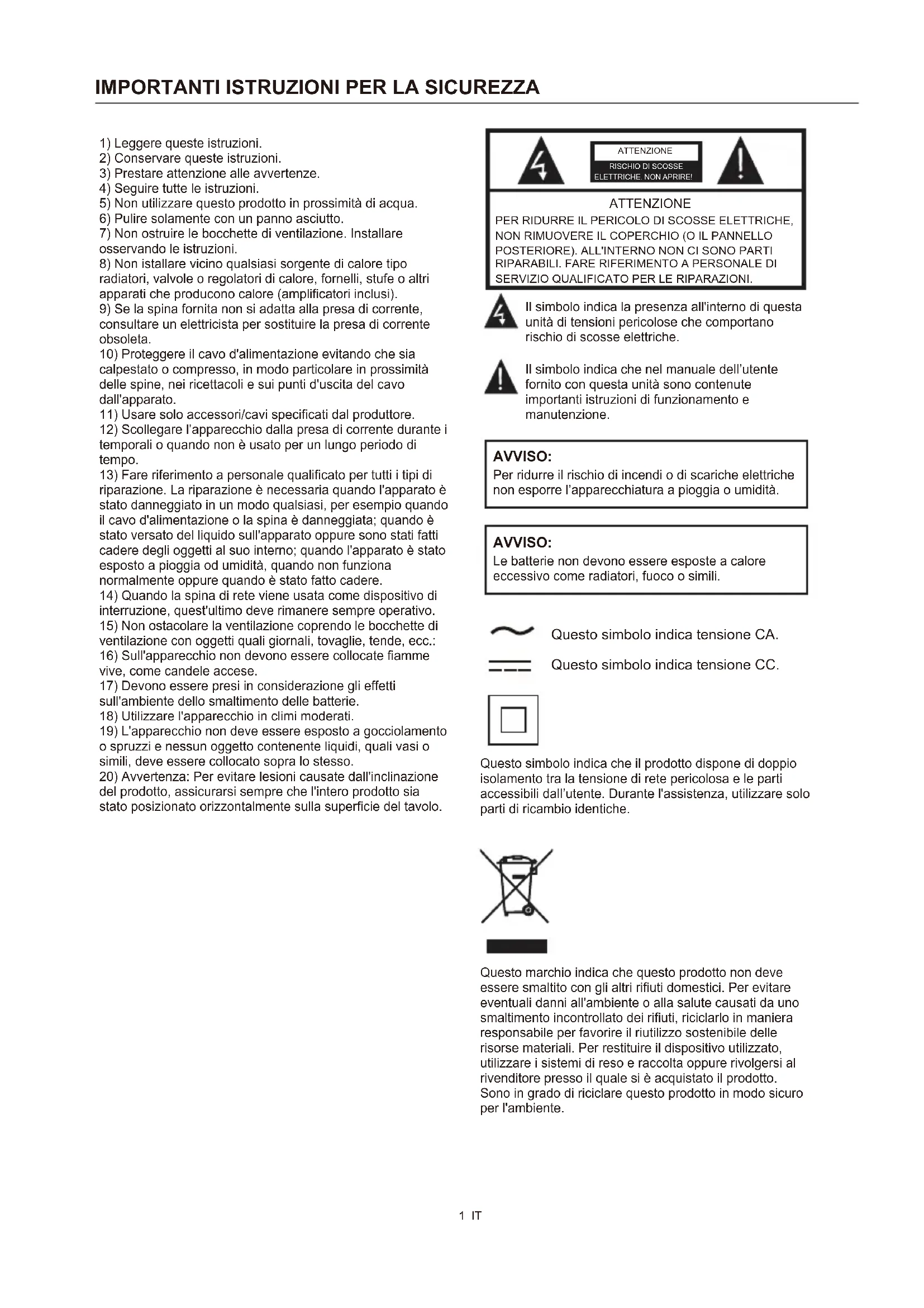 del prodotto, assicurarsi sempre che l'intero prodotto sia stato posizionato orizzontalmente sulla superficie del tavolo. PER RIDURRE IL PERICOLO DI SCOSSE ELETTRICHE, NON RIMUOVERE IL COPERCHIO (O IL PANNELLO
