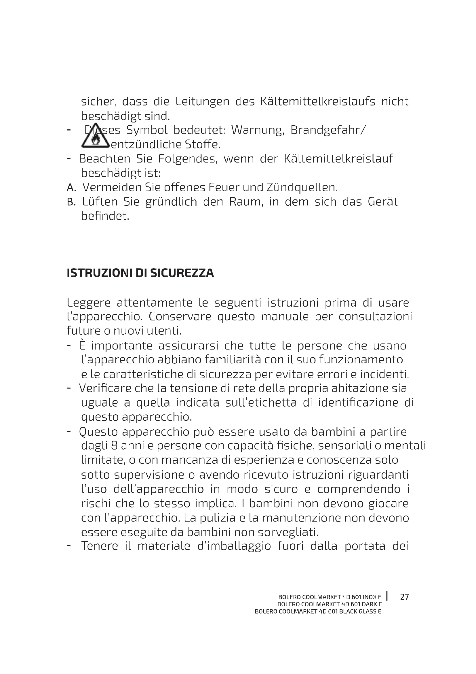 - Questo apparecchio ha un imballaggio progettato per proteggerlo durante il trasporto. Estrarre l’apparecchio dalla scatola e rimuovere tutto il materiale presente nell’imballaggio.BOLERO COOLMARKET 4D 601 INOX E