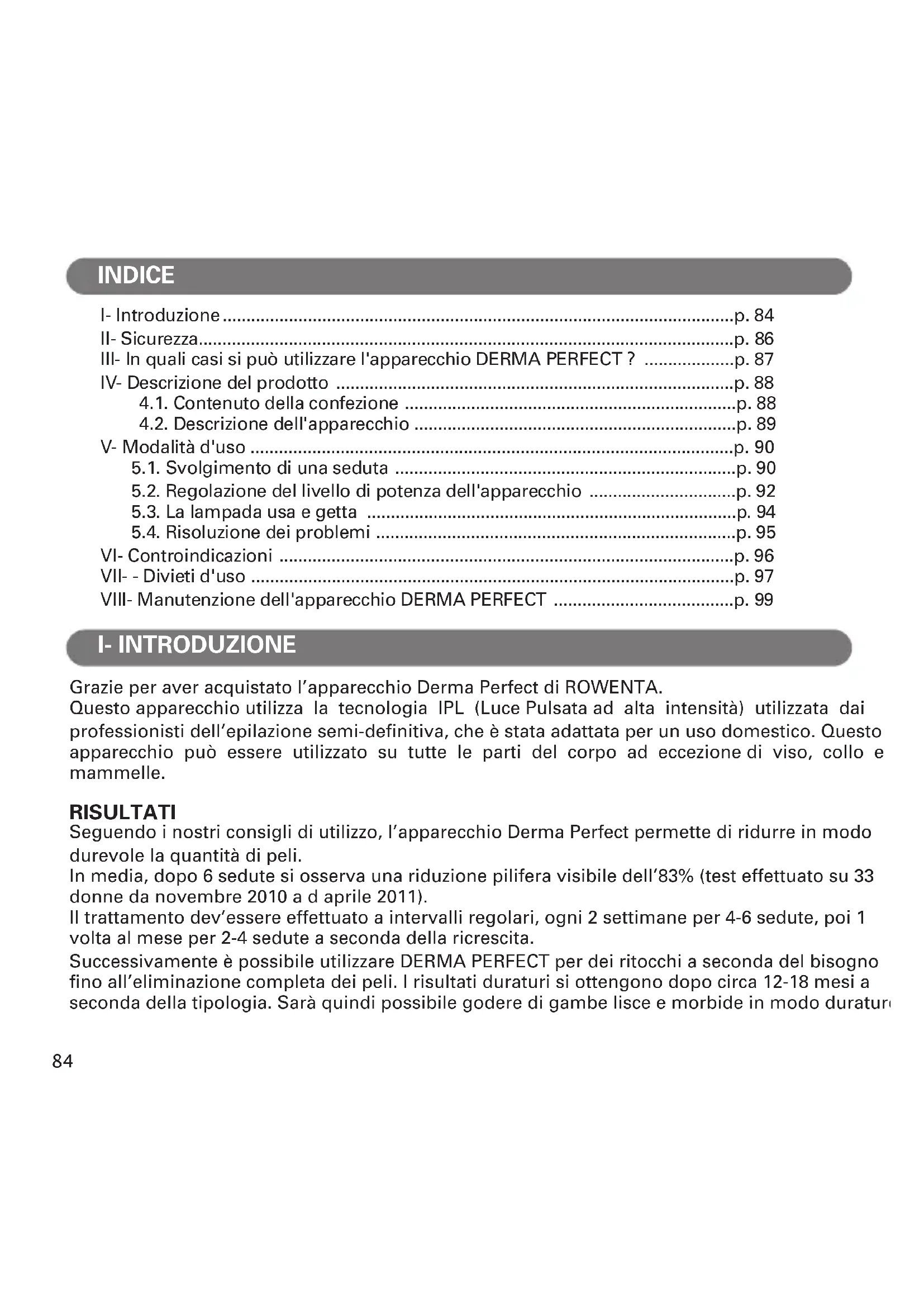 RO_EP9830_DERMA-PERFECT_1800122477_1800122477 03/02/12 15:53 Page83I- Introduzione............................................................................................................p. 84 II- Sicurezza.................................................................................................................p. 86 III- In quali casi si può utilizzare l'apparecchio DERMA PERFECT ? ...................p. 87 IV- Descrizione del prodotto ....................................................................................p. 88 4.1. Contenuto della confezione ......................................................................p. 88 4.2. Descrizione dell'apparecchio ....................................................................p. 89 V- Modalità d'uso ......................................................................................................p. 90 5.1. Svolgimento di una seduta ........................................................................p. 90 5.2. Regolazione del livello di potenza dell'apparecchio ...............................p. 92 5.3. La lampada usa e getta ..............................................................................p. 94 5.4. Risoluzione dei problemi ............................................................................p. 95 VI- Controindicazioni ................................................................................................p. 96 VII- - Divieti d'uso ......................................................................................................p. 97 VIII- Manutenzione dell'apparecchio DERMA PERFECT ......................................p. 99 Grazie per aver acquistato l’apparecchio Derma Perfect di ROWENTA. Questo apparecchio utilizza la tecnologia IPL (Luce Pulsata ad alta intensità) utilizzata dai professionisti dell’epilazione semi-definitiva, che è stata adattata per un uso domestico. Questo apparecchio può essere utilizzato su tutte le parti del corpo ad eccezione di viso, collo e mammelle. RISULTATI Seguendo i nostri consigli di utilizzo, l’apparecchio Derma Perfect permette di ridurre in modo durevole la quantità di peli. In media, dopo 6 sedute si osserva una riduzione pilifera visibile dell’83% (test effettuato su 33 donne da novembre 2010 a d aprile 2011). Il trattamento dev’essere effettuato a intervalli regolari, ogni 2 settimane per 4-6 sedute, poi 1 volta al mese per 2-4 sedute a seconda della ricrescita. Successivamente è possibile utilizzare DERMA PERFECT per dei ritocchi a seconda del bisogno fino all’eliminazione completa dei peli. I risultati duraturi si ottengono dopo circa 12-18 mesi a seconda della tipologia. Sarà quindi possibile godere di gambe lisce e morbide in modo duraturo. INDICE I- INTRODUZIONE