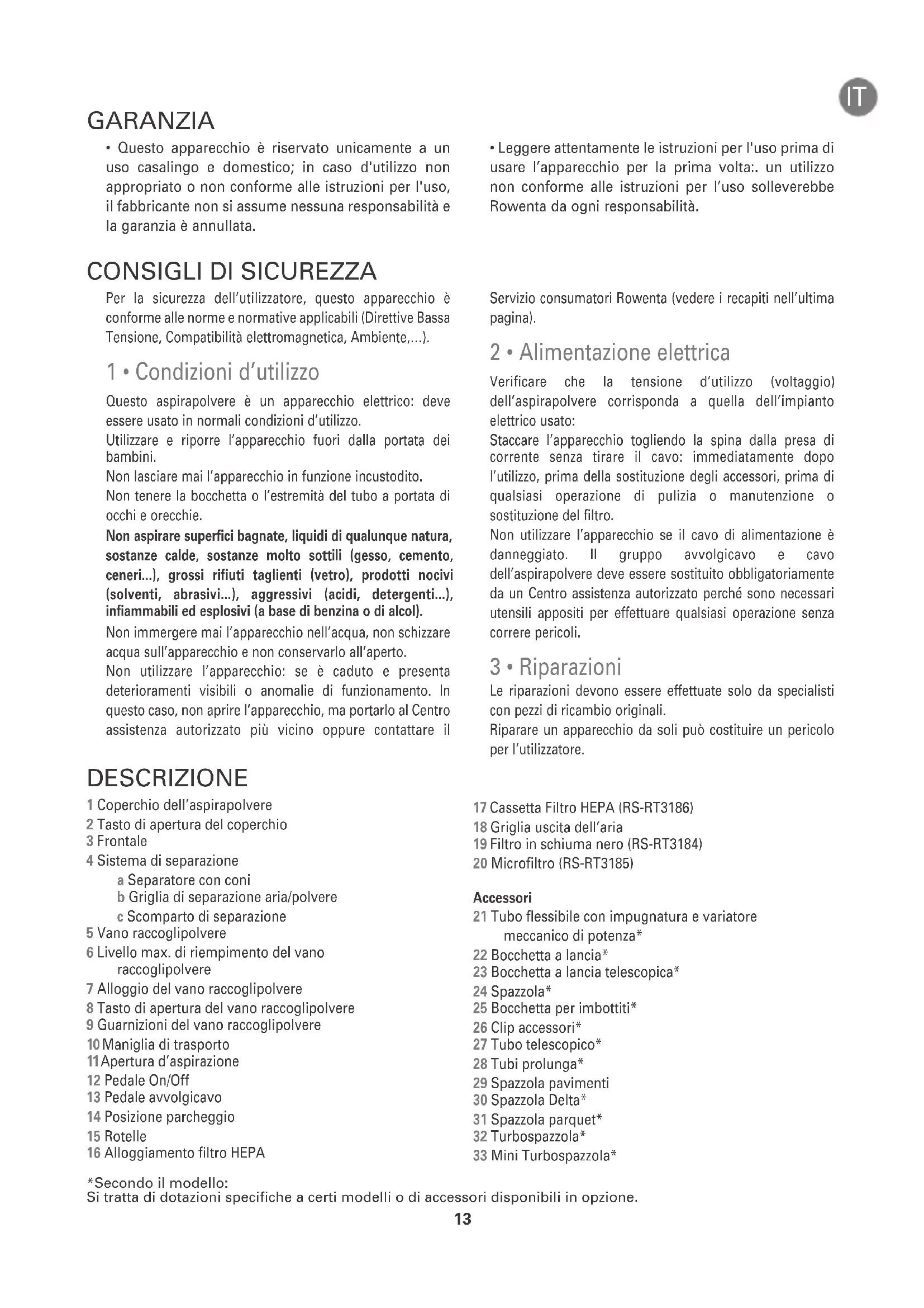 Connect the flexible hose on the vacuum cleaner. Fit the brush to the end of the power nozzle. Brush For corners and areas which are difficult to reach Fit the crevice tool or telescopic crevice tool to the end of the power nozzle. For fragile floors. Fit the parquet nozzle to the end of the tube. Crevice tool Parquet nozzle For cleaning furniture. Fit the upholstery nozzle to the end of the tube or the power nozzle. Upholstery nozzle To remove threads and animal hair embedded in rugs and carpets. Fit the turbobrush to the end of the tube. Turbobrush For deep cleaning of upholstery fabrics. Fit the mini turbobrush to the end of the tube. Mini turbobrush For cleaning carpets, rugs and smooth floors. Fit the Delta nozzle to the end of the tube. Delta nozzle *Depending on model: this is either equipment specific to certain models or available as an optional accessory. EN13 Per la sicurezza dell’utilizzatore, questo apparecchio è conforme alle norme e normative applicabili (Direttive Bassa Tensione, Compatibilità elettromagnetica, Ambiente,…). 1 • Condizioni d’utilizzo Questo aspirapolvere è un apparecchio elettrico: deve essere usato in normali condizioni d’utilizzo. Utilizzare e riporre l’apparecchio fuori dalla portata dei bambini. Non lasciare mai l’apparecchio in funzione incustodito. Non tenere la bocchetta o l’estremità del tubo a portata di occhi e orecchie. Non aspirare superfici bagnate, liquidi di qualunque natura, sostanze calde, sostanze molto sottili (gesso, cemento, ceneri...), grossi rifiuti taglienti (vetro), prodotti nocivi (solventi, abrasivi...), aggressivi (acidi, detergenti...), infiammabili ed esplosivi (a base di benzina o di alcol). Non immergere mai l’apparecchio nell’acqua, non schizzare acqua sull’apparecchio e non conservarlo all’aperto. Non utilizzare l’apparecchio: se è caduto e presenta deterioramenti visibili o anomalie di funzionamento. In questo caso, non aprire l’apparecchio, ma portarlo al Centro assistenza autorizzato più vicino oppure contattare il Servizio consumatori Rowenta (vedere i recapiti nell’ultima pagina). 2 • Alimentazione elettrica Verificare che la tensione d’utilizzo (voltaggio) dell’aspirapolvere corrisponda a quella dell’impianto elettrico usato: Staccare l’apparecchio togliendo la spina dalla presa di corrente senza tirare il cavo: immediatamente dopo l’utilizzo, prima della sostituzione degli accessori, prima di qualsiasi operazione di pulizia o manutenzione o sostituzione del filtro. Non utilizzare l’apparecchio se il cavo di alimentazione è danneggiato. Il gruppo avvolgicavo e cavo dell’aspirapolvere deve essere sostituito obbligatoriamente da un Centro assistenza autorizzato perché sono necessari utensili appositi per effettuare qualsiasi operazione senza correre pericoli. 3 • Riparazioni Le riparazioni devono essere effettuate solo da specialisti con pezzi di ricambio originali. Riparare un apparecchio da soli può costituire un pericolo per l’utilizzatore. DESCRIZIONE 1 Coperchio dell’aspirapolvere 2 Tasto di apertura del coperchio 3 Frontale 4 Sistema di separazione a Separatore con coni b Griglia di separazione aria/polvere c Scomparto di separazione 5 Vano raccoglipolvere 6 Livello max. di riempimento del vano raccoglipolvere 7 Alloggio del vano raccoglipolvere 8 Tasto di apertura del vano raccoglipolvere 9 Guarnizioni del vano raccoglipolvere 10 Maniglia di trasporto 11 Apertura d’aspirazione 12 Pedale On/Off 13 Pedale avvolgicavo 14 Posizione parcheggio 15 Rotelle 16 Alloggiamento filtro HEPA 17 Cassetta Filtro HEPA (RS-RT3186) 18 Griglia uscita dell’aria 19 Filtro in schiuma nero (RS-RT3184) 20 Microfiltro (RS-RT3185) Accessori 21 Tubo flessibile con impugnatura e variatore meccanico di potenza* 22 Bocchetta a lancia* 23 Bocchetta a lancia telescopica* 24 Spazzola* 25 Bocchetta per imbottiti* 26 Clip accessori* 27 Tubo telescopico* 28 Tubi prolunga* 29 Spazzola pavimenti 30 Spazzola Delta* 31 Spazzola parquet* 32 Turbospazzola* 33 Mini Turbospazzola* *Secondo il modello: Si tratta di dotazioni specifiche a certi modelli o di accessori disponibili in opzione.