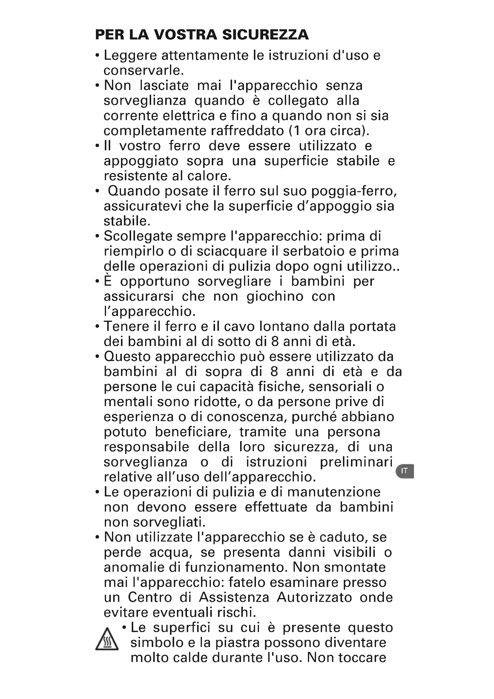 - Tenere il ferro e il cavo lontano dalla portata dei bambini al di sotto di 8 anni di età.