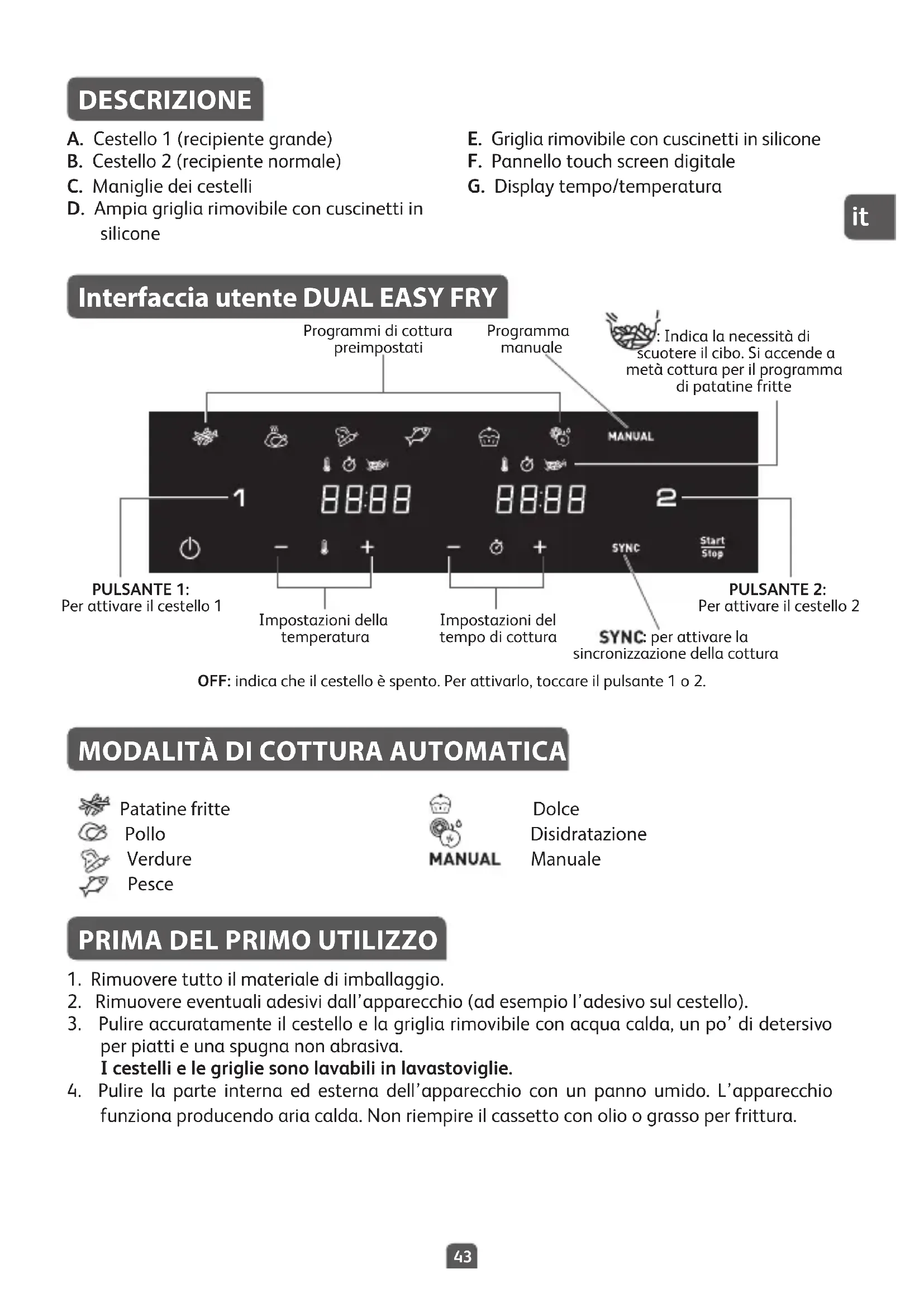 funziona producendo aria calda. Non riempire il cassetto con olio o grasso per frittura. OFF: indica che il cestello è spento. Per attivarlo, toccare il pulsante 1 o 2. Programmi di cottura preimpostati Programma manuale : per attivare la sincronizzazione della cottura Impostazioni della temperatura Impostazioni del tempo di cottura PULSANTE 1: Per attivare il cestello 1 PULSANTE 2: Per attivare il cestello 2 : Indica la necessità di scuotere il cibo. Si accende a metà cottura per il programma di patatine fritteit