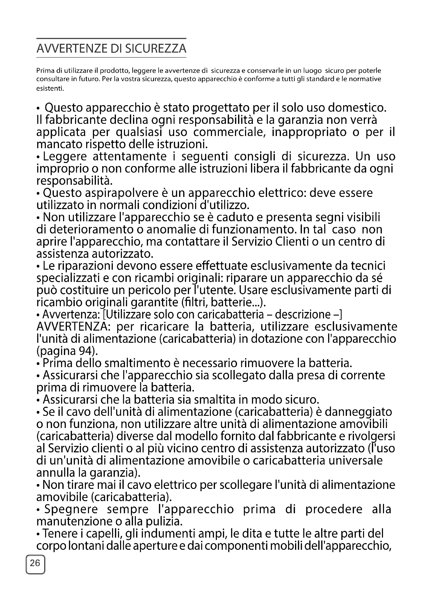 - Leggere attentamente i seguenti consigli di sicurezza. Un uso improprio o non conforme alle istruzioni libera il fabbricante da ogni responsabilità.