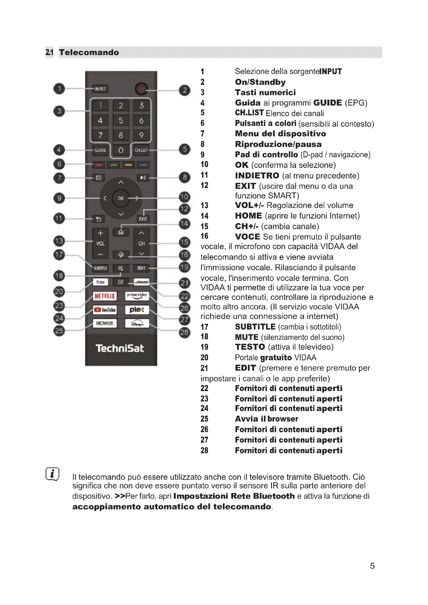 Fornitori di contenuti aperti Il telecomando può essere utilizzato anche con il televisore tramite Bluetooth. Ciò significa che non deve essere puntato verso il sensore IR sulla parte anteriore del dispositivo. >>Per farlo, apri Impostazioni Rete Bluetooth e attiva la funzione di accoppiamento automatico del telecomando.6
