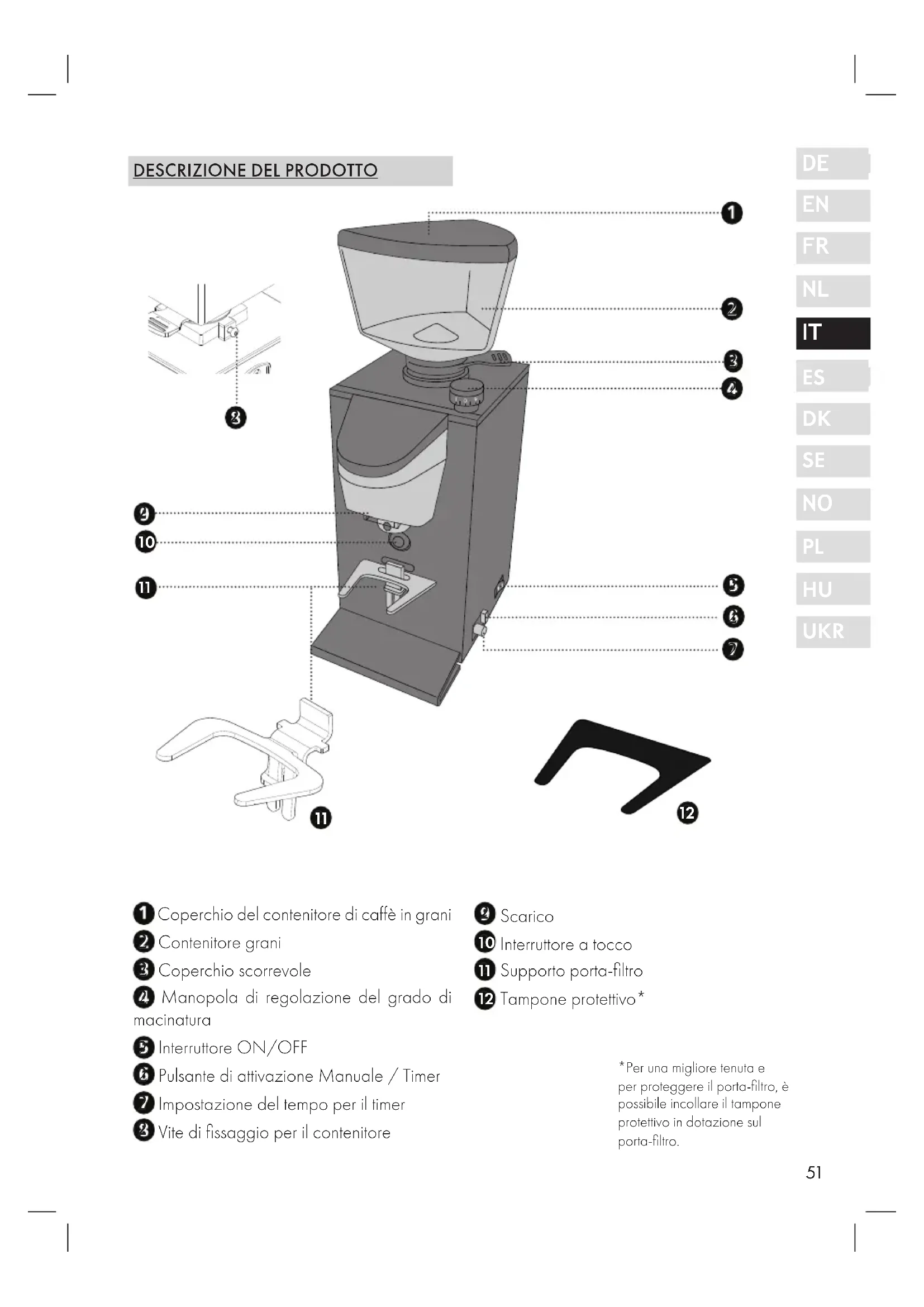 *Per una migliore tenuta e per proteggere il porta-filtro, è possibile incollare il tampone protettivo in dotazione sul porta-filtro.52 PREFAZIONE Gentile Cliente, Acquistando questo macinacaffè avete fatto un'ottima scelta. Ha acquistato un prodotto di qualità comprovata. Vi ringraziamo e vi auguriamo molta soddisfazione nell'uso del vostro macinacaffè Graef. INFORMAZIONI RELATIVE A QUESTE ISTRUZIONI PER L'USO Queste istruzioni per l'uso sono parte integrante del macinacaffè (di seguito denominato di- spositivo) e contengono importanti indicazioni per la messa in funzione, la sicurezza, l'uso conforme e la cura dello stesso. Le istruzioni per l'uso devono essere sempre disponibili presso il dispositivo. Devono essere lette e rispettate da chiunque sia incaricato con la: ● Messa in servizio, ● Gestione, ● Risoluzione di disfunzioni e/o la ● Pulizia Conservare queste istruzioni per l'uso e consegnatele al successivo proprietario assieme al dispositivo stesso. Queste istruzioni d’uso non possono coprire tutti gli aspetti possibili ed immaginabili. Per mag- giori informazioni o per problemi, non o non esaurientemente trattati nel presente manuale, rivolgersi al servizio assistenza clienti di Graef o a un suo rivenditore.