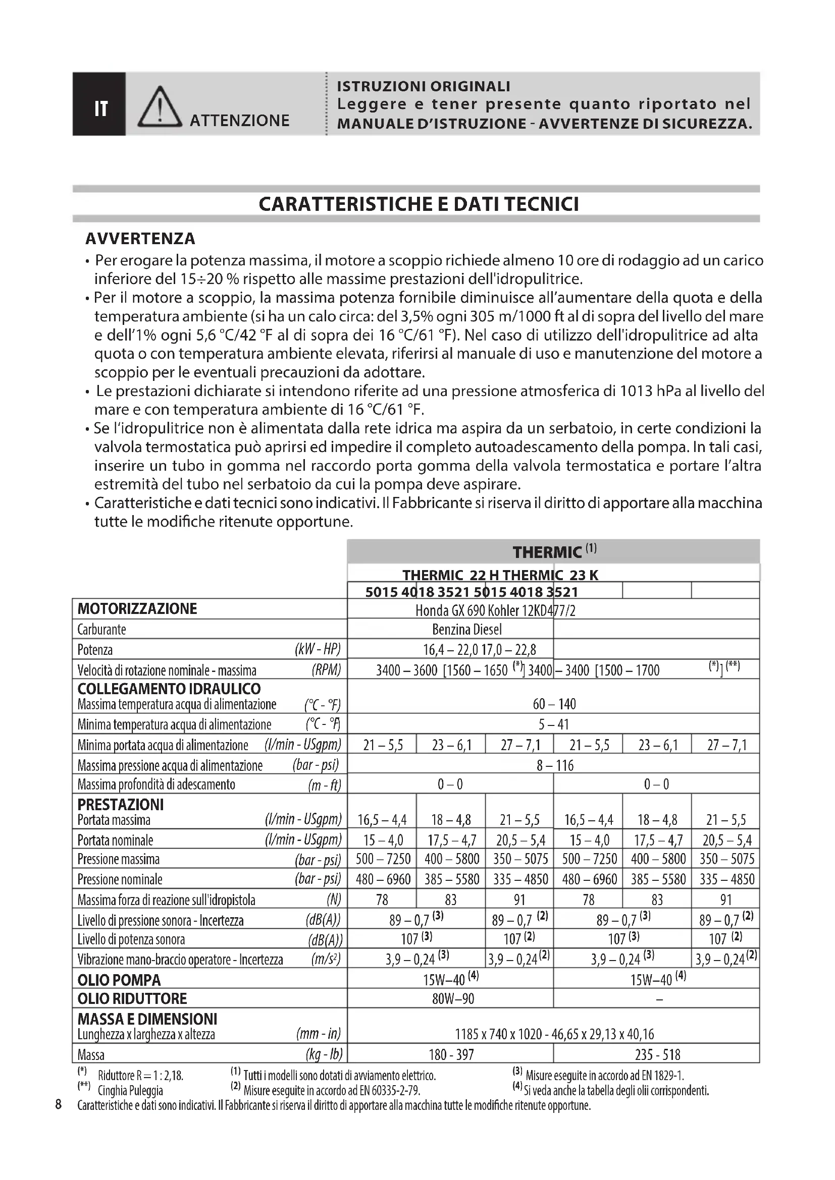 Riduttore R = 1 : 2,18.(**) Cinghia Puleggia(1) Tutti i modelli sono dotati di avviamento elettrico.(2) Misure eseguite in accordo ad EN 60335-2-79. (3) Misure eseguite in accordo ad EN 1829-1. (4) Si veda anche la tabella degli olii corrispondenti. Caratteristiche e dati sono indicativi. Il Fabbricante si riserva il diritto di apportare alla macchina tutte le modiche ritenute opportune.