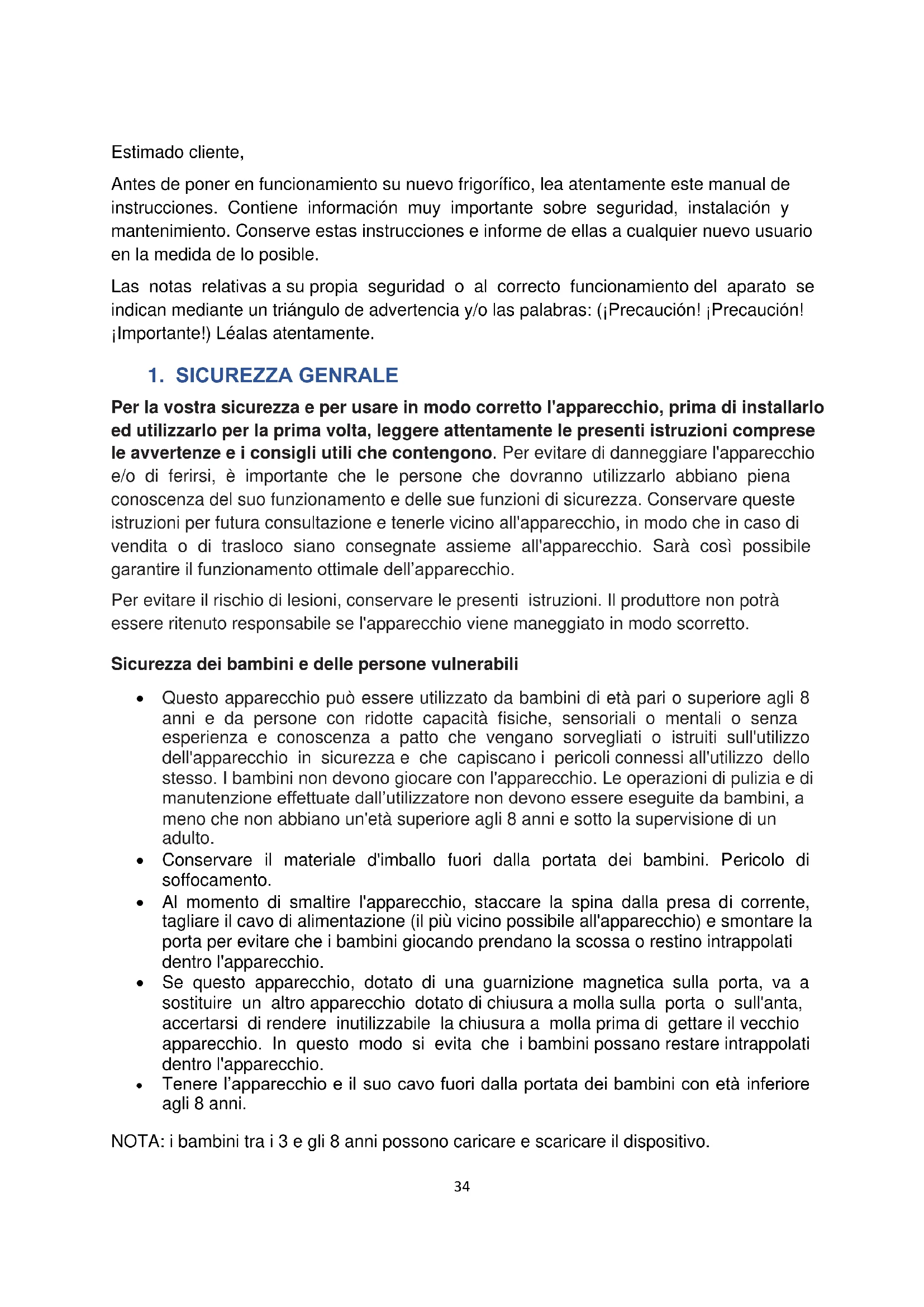 Per la vostra sicurezza e per usare in modo corretto l'apparecchio, prima di installarlo ed utilizzarlo per la prima volta, leggere attentamente le presenti istruzioni comprese le avvertenze e i consigli utili che contengono. Per evitare di danneggiare l'apparecchio e/o di ferirsi, è importante che le persone che dovranno utilizzarlo abbiano piena conoscenza del suo funzionamento e delle sue funzioni di sicurezza. Conservare queste istruzioni per futura consultazione e tenerle vicino all'apparecchio, in modo che in caso di vendita o di trasloco siano consegnate assieme all'apparecchio. Sarà così possibile garantire il funzionamento ottimale dell’apparecchio. Per evitare il rischio di lesioni, conservare le presenti istruzioni. Il produttore non potrà essere ritenuto responsabile se l'apparecchio viene maneggiato in modo scorretto. Sicurezza dei bambini e delle persone vulnerabili