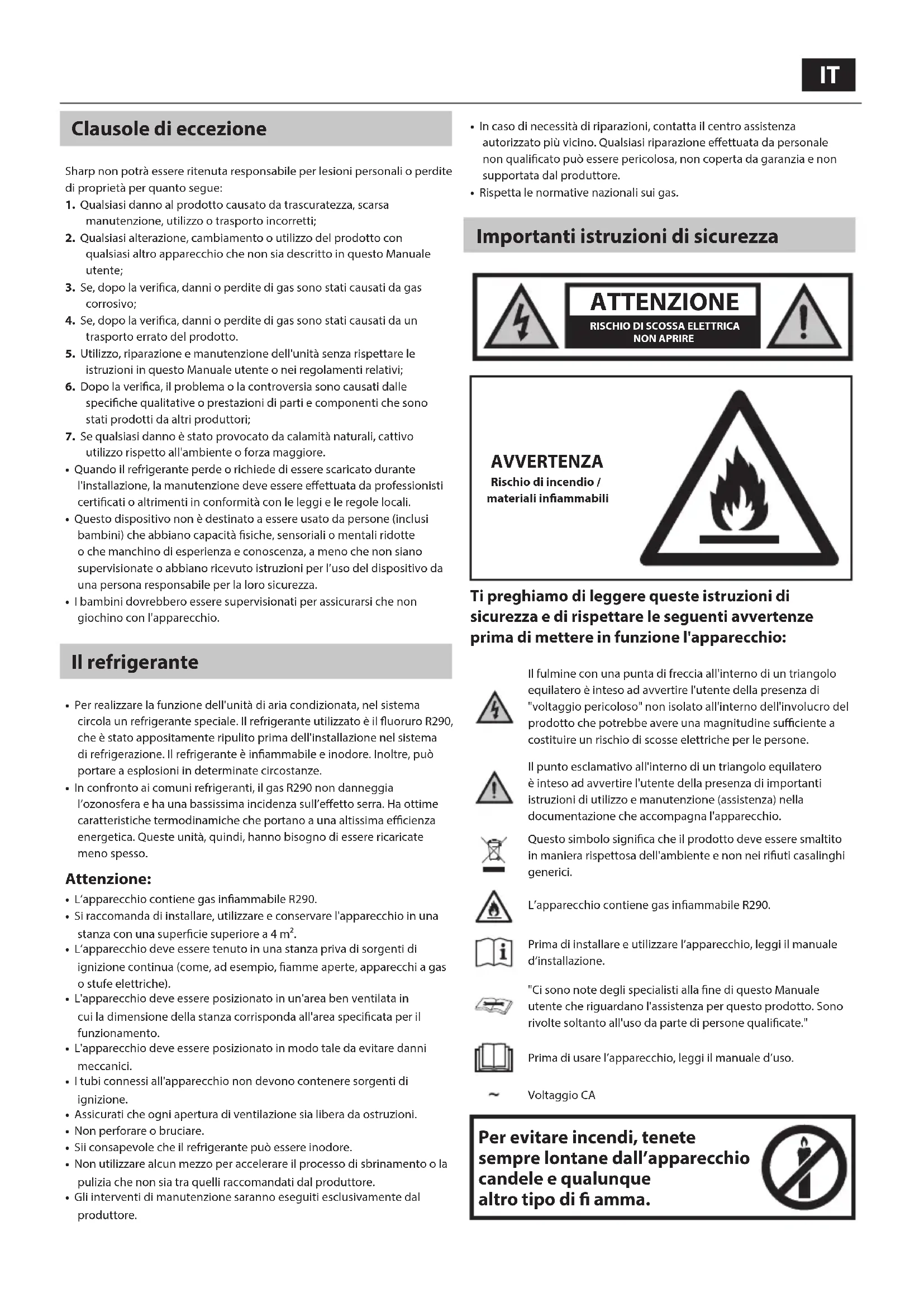 Réfrigérant R290 Charge de réfrigérant (g) 175 Les spécications techniques peuvent être modiées sans préavis.IT Clausole di eccezione Sharp non potrà essere ritenuta responsabile per lesioni personali o perdite di proprietà per quanto segue:1. Qualsiasi danno al prodotto causato da trascuratezza, scarsa manutenzione, utilizzo o trasporto incorretti;2. Qualsiasi alterazione, cambiamento o utilizzo del prodotto con qualsiasi altro apparecchio che non sia descritto in questo Manuale utente;3. Se, dopo la verica, danni o perdite di gas sono stati causati da gas corrosivo;4. Se, dopo la verica, danni o perdite di gas sono stati causati da un trasporto errato del prodotto.5. Utilizzo, riparazione e manutenzione dell'unità senza rispettare le istruzioni in questo Manuale utente o nei regolamenti relativi;6. Dopo la verica, il problema o la controversia sono causati dalle speciche qualitative o prestazioni di parti e componenti che sono stati prodotti da altri produttori;7. Se qualsiasi danno è stato provocato da calamità naturali, cattivo utilizzo rispetto all'ambiente o forza maggiore.• Quando il refrigerante perde o richiede di essere scaricato durante l'installazione, la manutenzione deve essere eettuata da professionisti certicati o altrimenti in conformità con le leggi e le regole locali.• Questo dispositivo non è destinato a essere usato da persone (inclusi bambini) che abbiano capacità siche, sensoriali o mentali ridotte o che manchino di esperienza e conoscenza, a meno che non siano supervisionate o abbiano ricevuto istruzioni per l’uso del dispositivo da una persona responsabile per la loro sicurezza.• I bambini dovrebbero essere supervisionati per assicurarsi che non giochino con l'apparecchio. Il refrigerante