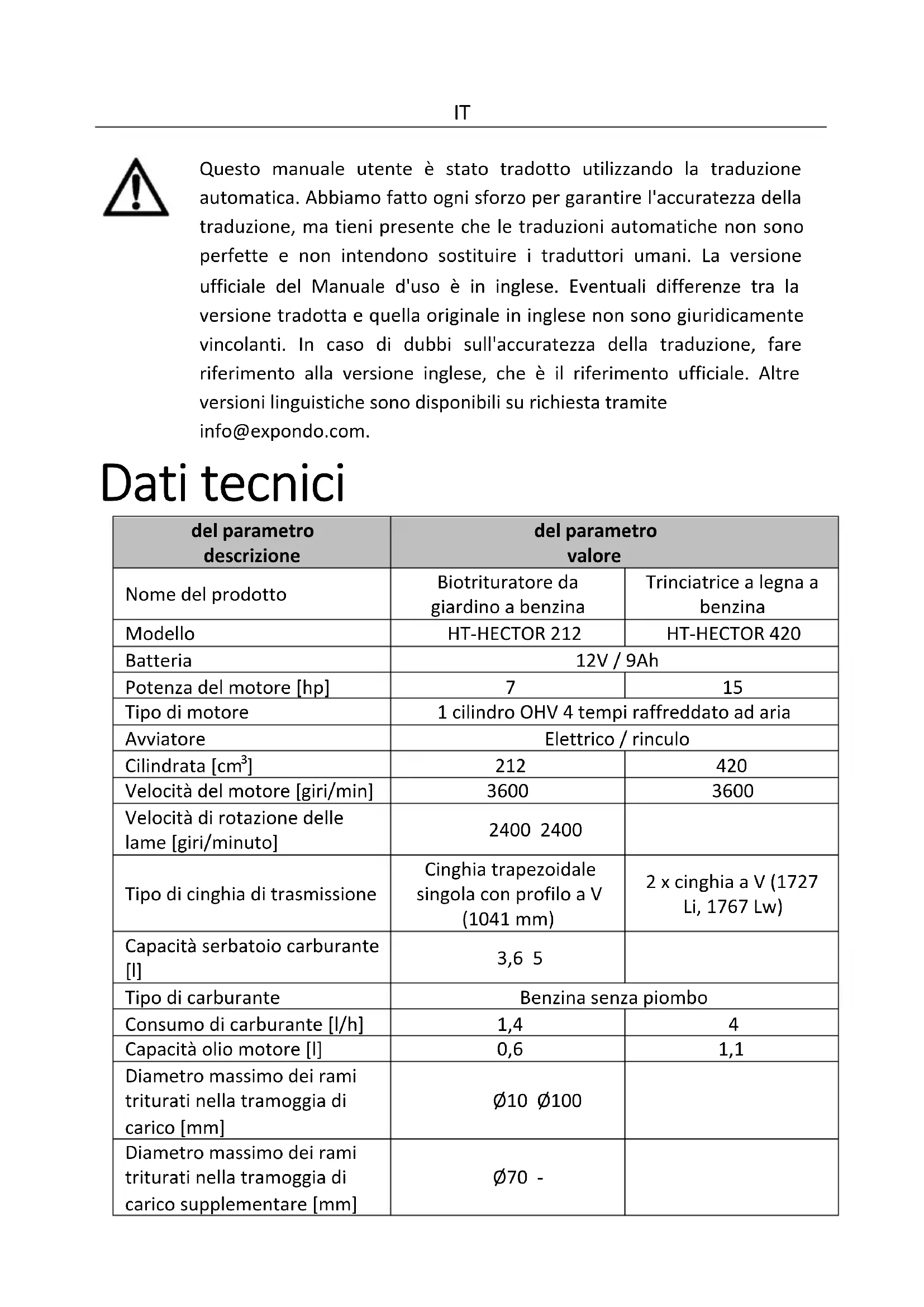 Questo manuale utente è stato tradotto utilizzando la traduzione automatica. Abbiamo fatto ogni sforzo per garantire l'accuratezza della traduzione, ma tieni presente che le traduzioni automatiche non sono perfette e non intendono sostituire i traduttori umani. La versione ufficiale del Manuale d'uso è in inglese. Eventuali differenze tra la versione tradotta e quella originale in inglese non sono giuridicamente vincolanti. In caso di dubbi sull'accuratezza della traduzione, fare riferimento alla versione inglese, che è il riferimento ufficiale. Altre versioni linguistiche sono disponibili su richiesta tramite info@expondo.com. Dati tecnici del parametro descrizione del parametro valore Nome del prodotto Biotrituratore da giardino a benzina Trinciatrice a legna a benzina Modello HT-HECTOR 212 HT-HECTOR 420 Batteria 12V / 9Ah Potenza del motore [hp]