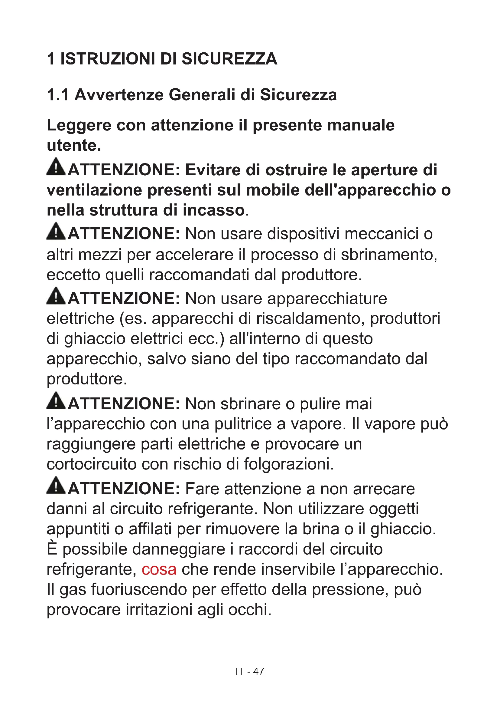 ATTENZIONE: Non usare dispositivi meccanici o altri mezzi per accelerare il processo di sbrinamento, eccetto quelli raccomandati dal produttore.