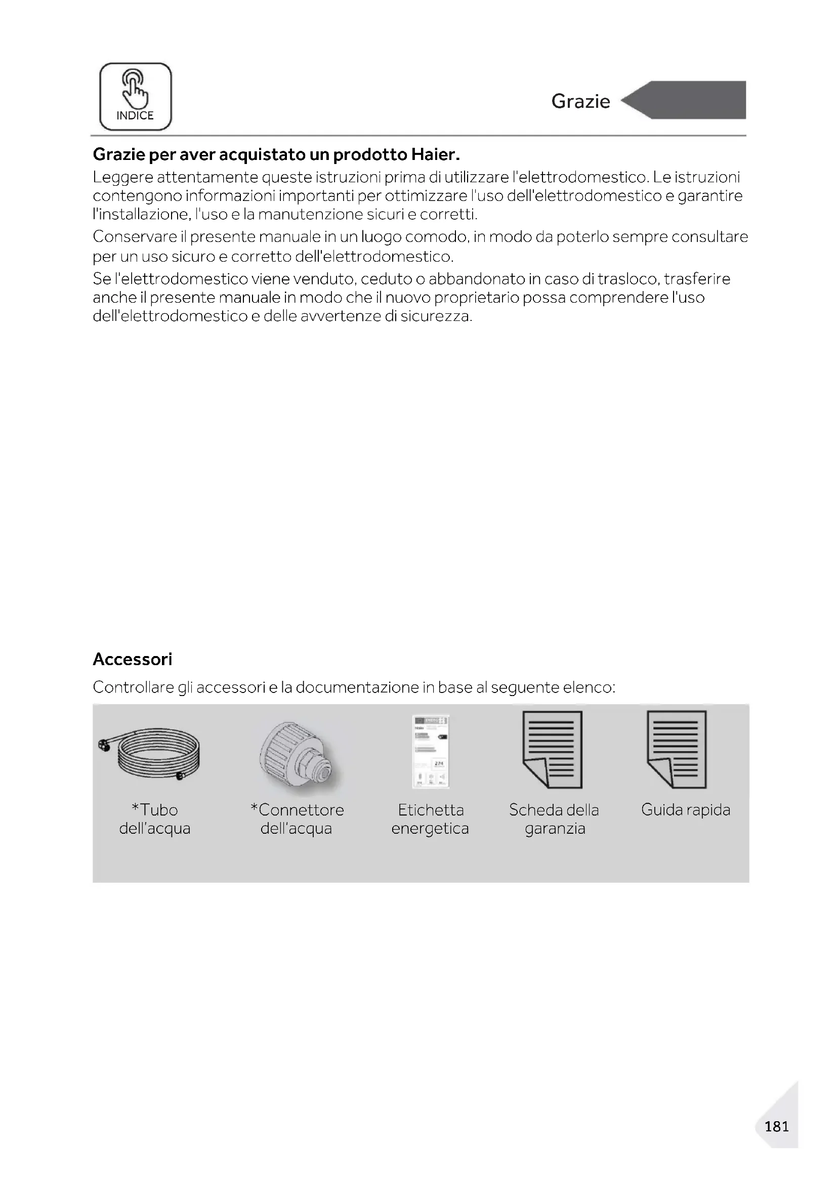 *Tubo dell’acqua *Connettore dell’acqua Etichetta energetica Scheda della garanzia Guida rapida182 Informazioni per la sicurezza INDICE Informazioni per la sicurezza AVVERTENZA - Informazioni importanti per la sicurezza AVVISO - Informazioni generali e consigli Informazioni ambientali Smaltimento Contribuire a proteggere l'ambiente e la salute umana. Collocare l'imballo in appositi contenitori affinché venga riciclato. Contribuire al riciclo dei rifiuti delle apparecchiature elettriche ed elettroniche. Non smaltire gli elettrodomestici contrassegnati con questo simbolo assieme ai rifiuti domestici. Conferire il prodotto presso la struttura di riciclo locale o rivolgersi all'ufficio comunale preposto. AVVERTENZA! Pericolo di lesioni o soffocamento! I refrigeranti e i gas devono essere smaltiti in maniera professionale. Accertarsi che la tubazione del circuito del refrigerante non sia danneggiata prima di smaltirla correttamente. Scollegare l'elettrodomestico dalla rete elettrica. Tagliare il cavo di alimentazione e smaltirlo. Rimuovere vassoi e cassetti, fermaporte e guarnizioni, per evitare che bambini e animali domestici rimangano chiusi nell'elettrodomestico.183 Informazioni per la sicurezza INDICE Prima di accendere l'elettrodomestico per la prima volta, leggere i seguenti consigli sulla sicurezza: AVVERTENZA! Operazioni preliminari al primo utilizzo ► Accertarsi dell'assenza di danni dovuti al trasporto. ► Rimuovere tutti gli elementi di imballo e tenerli fuori dalla portata dei bambini. ► Per garantire la totale efficienza del circuito del refrigerante, attendere almeno due ore prima di installare l'elettrodomestico. ► L'elettrodomestico deve essere maneggiato sempre da almeno due persone perché è pesante. Installazione ► Installare l'elettrodomestico in un luogo asciutto e ben ventilato. Lasciare uno spazio libero di almeno 10 cm sopra e attorno all'elettrodomestico. ► Non collocare mai l'elettrodomestico in zone umide o soggette a schizzi d'acqua. Pulire e asciugare schizzi e macchie d'acqua con un panno morbido e pulito. ► Non installare l'elettrodomestico esposto alla luce diretta del sole o in prossimità di fonti di calore (ad es. stufe o radiatori). ► Installare l'elettrodomestico a livello in un'area adatta alle dimensioni e all'uso. ► Le aperture di ventilazione nell'elettrodomestico o nella struttura a incasso devono rimanere sempre libere. ► Accertarsi che i dati elettrici sulla targhetta siano conformi all'alimentazione elettrica. In caso contrario, rivolgersi a un elettricista. ► L'elettrodomestico funziona con corrente elettrica 220-240 Vca / 50 Hz. Oscillazioni anomale della tensione possono causare il mancato avvio dell'elettrodomestico, danni al controllo della temperatura o al compressore oppure rumori anomali durante il funzionamento. In tal caso, è opportuno montare un regolatore automatico. ► Non adoperare prese multiple o cavi di prolunga. ► Non collocare prese multiple o alimentatori portatili nella parte posteriore dell'elettrodomestico. ► Accertarsi che il cavo di alimentazione non sia intrappolato dal frigorifero. Non calpestare il cavo di alimentazione.184 Informazioni per la sicurezza INDICE AVVERTENZA! ► Per l'alimentazione elettrica utilizzare una presa separata collegata a terra e facilmente accessibile. L'elettrodomestico deve essere collegato a terra. Solo per il Regno Unito: il cavo di alimentazione dell'elettrodomestico è dotato di una spina a 3 conduttori (collegata a terra) adatta a una presa standard a 3 conduttori (collegata a terra). Non tagliare né smontare mai il terzo conduttore (collegamento a terra). Dopo l'installazione dell'elettrodomestico, la spina deve essere accessibile. ► non danneggiare il circuito di refrigerazione. Utilizzo quotidiano ► Questo elettrodomestico può essere utilizzato da bambini di almeno 8 anni, da persone con ridotte capacità fisiche, sensoriali o mentali e da persone inesperte solo sotto stretta sorveglianza o se hanno appreso le modalità di utilizzo sicuro dell'elettro- domestico e sono consapevoli dei relativi pericoli. ► I bambini di età da 3 a 8 anni possono riempire e svuotare gli elettrodomestici refrigeranti, ma non devono pulirli o installarli. ► Tenere lontano dall'elettrodomestico i bambini di età inferiore a 3 anni, a meno che non siano costantemente sorvegliati. ► Impedire ai bambini di giocare con l'elettrodomestico. ► In caso di perdite di gas refrigerante o altri gas infiammabili in prossimità dell'elettrodomestico, chiudere la valvola del gas che fuoriesce, aprire porte e finestre e non staccare la spina del cavo di alimentazione del frigorifero o di altri elettro- domestici. ► Si noti che l'elettrodomestico è impostato per il funzionamento in un intervallo ambiente specifico compreso tra 10 e 38 °C. L'elettrodomestico potrebbe non funzionare correttamente se lasciato per un lungo periodo a una temperatura superiore o inferiore all'intervallo indicato. ► Non collocare elementi instabili (oggetti pesanti, contenitori pieni d'acqua) sopra il frigorifero, per evitare lesioni personali dovute a cadute o scosse elettriche causate dal contatto con l'acqua. ► Non caricare eccessivamente gli scaffali dello sportello. Lo sportello potrebbe defor- marsi, il portabottiglie potrebbe fuoriuscire o l'elettrodomestico potrebbe rovesciarsi. ► Aprire e chiudere gli sportelli solo adoperando le maniglie. La distanza tra gli sportelli e tra gli sportelli e il vano è molto limitata. Non allungare le mani in queste zone per evitare che le dita rimangano intrappolate. Aprire o chiudere gli sportelli del frigorifero solo quando non ci sono bambini nel raggio di movimento degli sportelli.185 Informazioni per la sicurezza INDICE AVVERTENZA! ► Non conservare né utilizzare materiali esplosivi o corrosivi nell'elettrodomestico o nelle vicinanze. ► Non conservare medicinali, batteri o sostanze chimiche nell'elettrodomestico. Questo apparecchio è un el