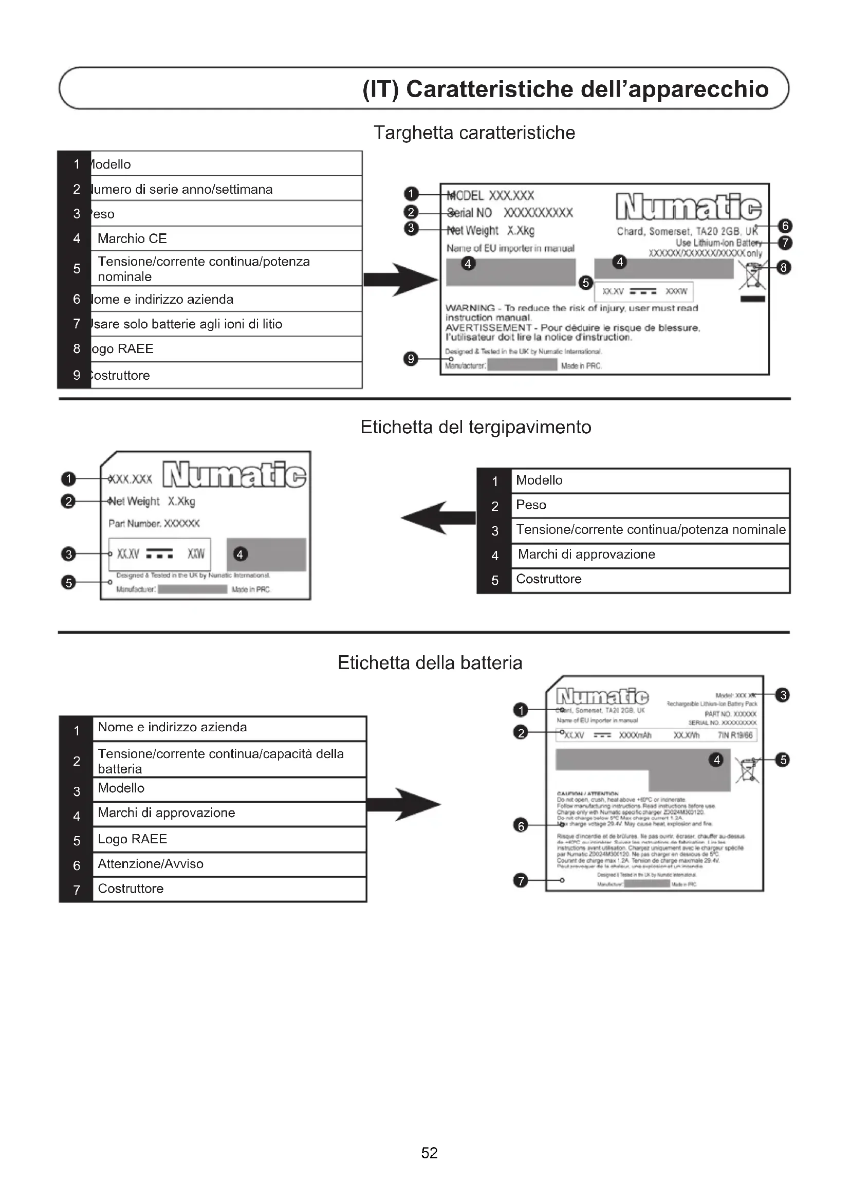 1 Modello 2 Numero di serie anno/settimana 3 Peso 4 Marchio CE