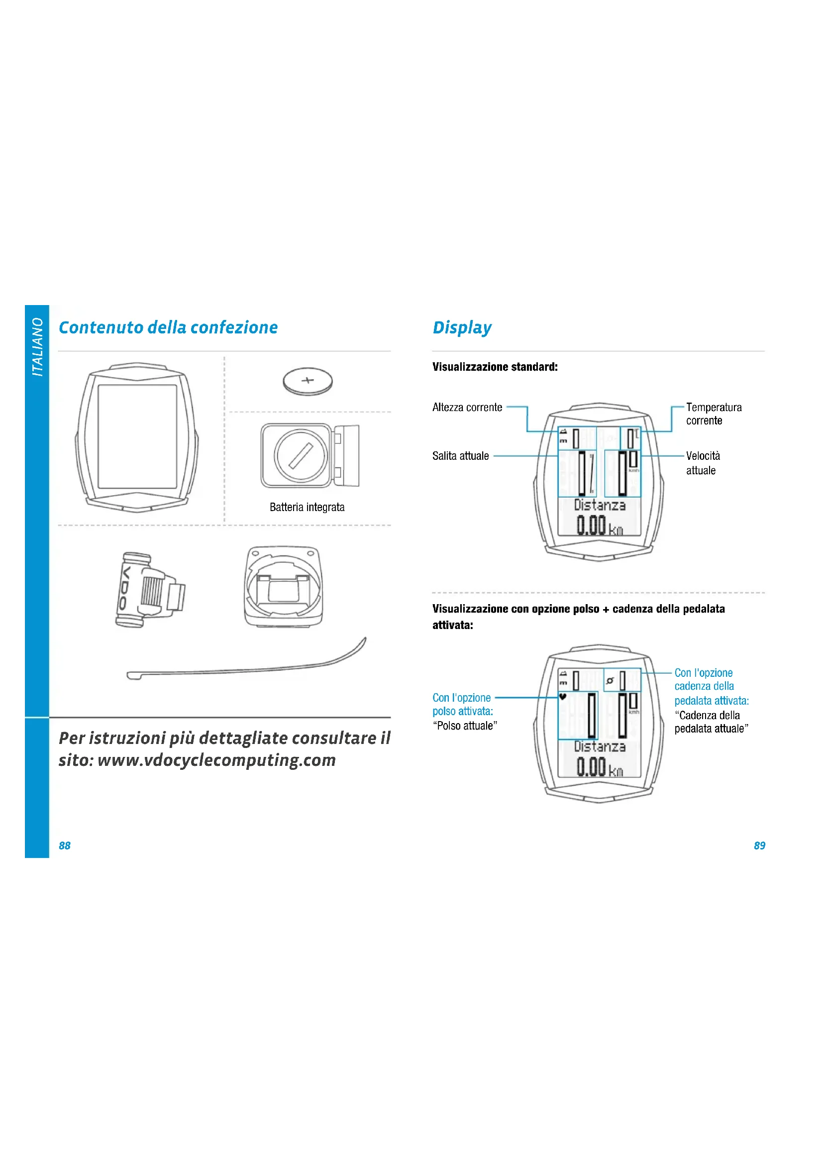 Contenuto della confezione Batteria integrata Per istruzioni più dettagliate consultare il sito: www.vdocyclecomputing.com Display Velocità attuale Salita attuale Temperatura corrente Altezza corrente Visualizzazione standard: Con l'opzione polso attivata: “Polso attuale” Con l'opzione cadenza della pedalata attivata: “Cadenza della pedalata attuale” Visualizzazione con opzione polso + cadenza della pedalata attivata:ITALIANO
