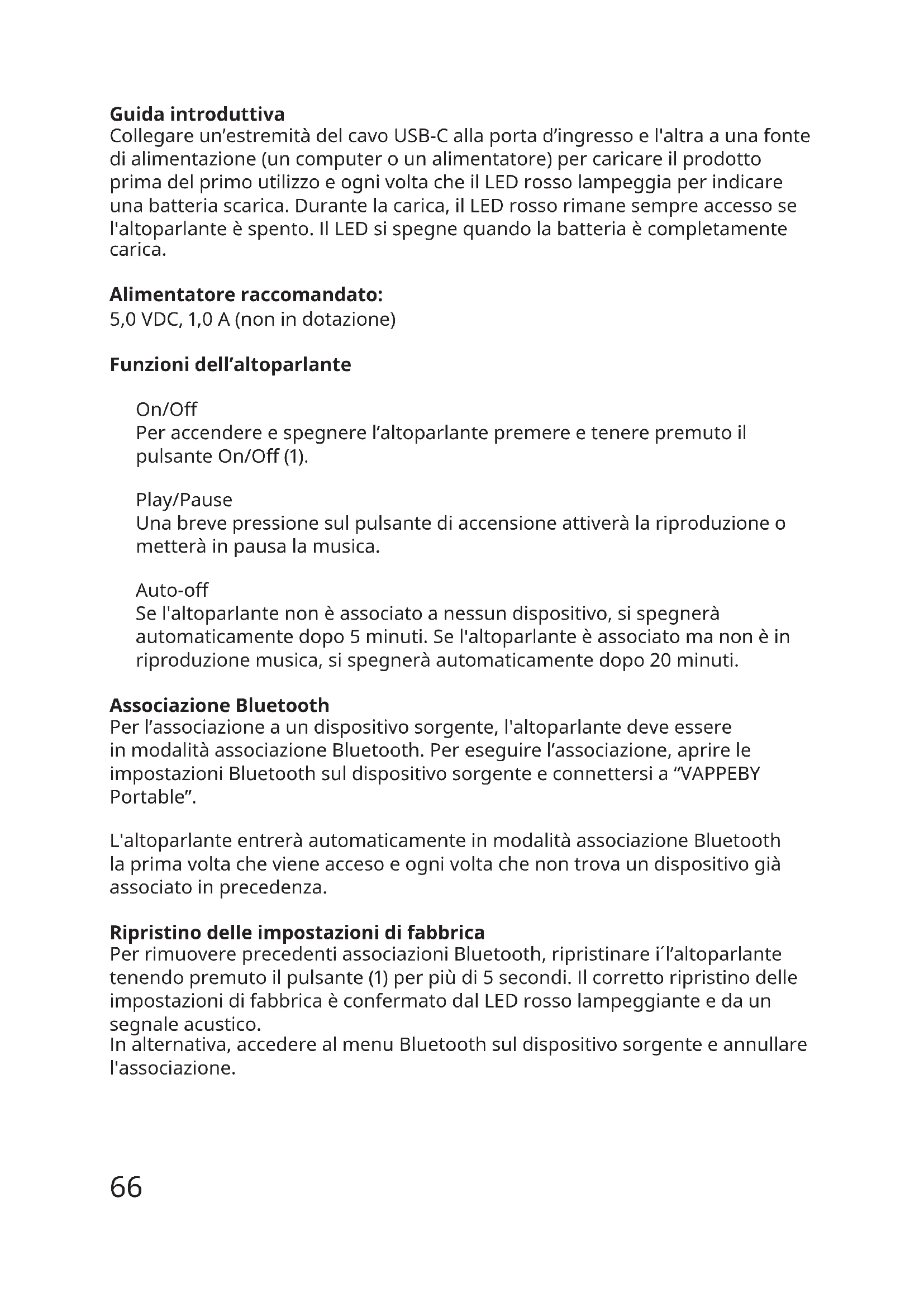 LED stato Bianco lampeggiante:AssociazioneBluetooth. Biancosso:Associatoaundispositivo. Rosso lampeggiante:Batteriascarica. Rossosso:Incarica(quandol'altoparlanteèspento). Italiano66 Guida introduttiva Collegareun’estremitàdelcavoUSB-Callaportad’ingressoel'altraaunafonte dialimentazione(uncomputerounalimentatore)percaricareilprodotto primadelprimoutilizzoeognivoltacheilLEDrossolampeggiaperindicare unabatteriascarica.Durantelacarica,ilLEDrossorimanesempreaccessose l'altoparlanteèspento.IlLEDsispegnequandolabatteriaècompletamente carica. Alimentatore raccomandato: 5,0VDC,1,0A(nonindotazione) Funzioni dell’altoparlante On/O Peraccendereespegnerel’altoparlantepremereetenerepremutoil pulsanteOn/O(1). Play/Pause Unabrevepressionesulpulsantediaccensioneattiveràlariproduzioneo metteràinpausalamusica. Auto-o Sel'altoparlantenonèassociatoanessundispositivo,sispegnerà automaticamentedopo5minuti.Sel'altoparlanteèassociatomanonèin riproduzionemusica,sispegneràautomaticamentedopo20minuti. Associazione Bluetooth Perl’associazioneaundispositivosorgente,l'altoparlantedeveessere inmodalitàassociazioneBluetooth.Pereseguirel’associazione,aprirele impostazioniBluetoothsuldispositivosorgenteeconnettersia“VAPPEBY Portable”. L'altoparlanteentreràautomaticamenteinmodalitàassociazioneBluetooth laprimavoltachevieneaccesoeognivoltachenontrovaundispositivogià associatoinprecedenza. Ripristinodelleimpostazionidifabbrica PerrimuovereprecedentiassociazioniBluetooth,ripristinarei´l’altoparlante tenendopremutoilpulsante(1)perpiùdi5secondi.Ilcorrettoripristinodelle impostazionidifabbricaèconfermatodalLEDrossolampeggianteedaun segnaleacustico. Inalternativa,accederealmenuBluetoothsuldispositivosorgenteeannullare l'associazione.67 Associazione stereo: ÈpossibileassociareduedispositiviportatiliVAPPEBYinmodalitàstereo: 1.AssicuraticheentrambiglialtoparlantisianoinmodalitàricercaBluetooth. 2.Premereduevolteilpulsantediaccensionesuunodeglialtoparlanti.Un segnaleacusticoconfermeràlacorrettaassociazionestereo. 3.Connettersialdispositivosorgenteseguendoleistruzionidiassociazione Bluetooth. Informazioni utili