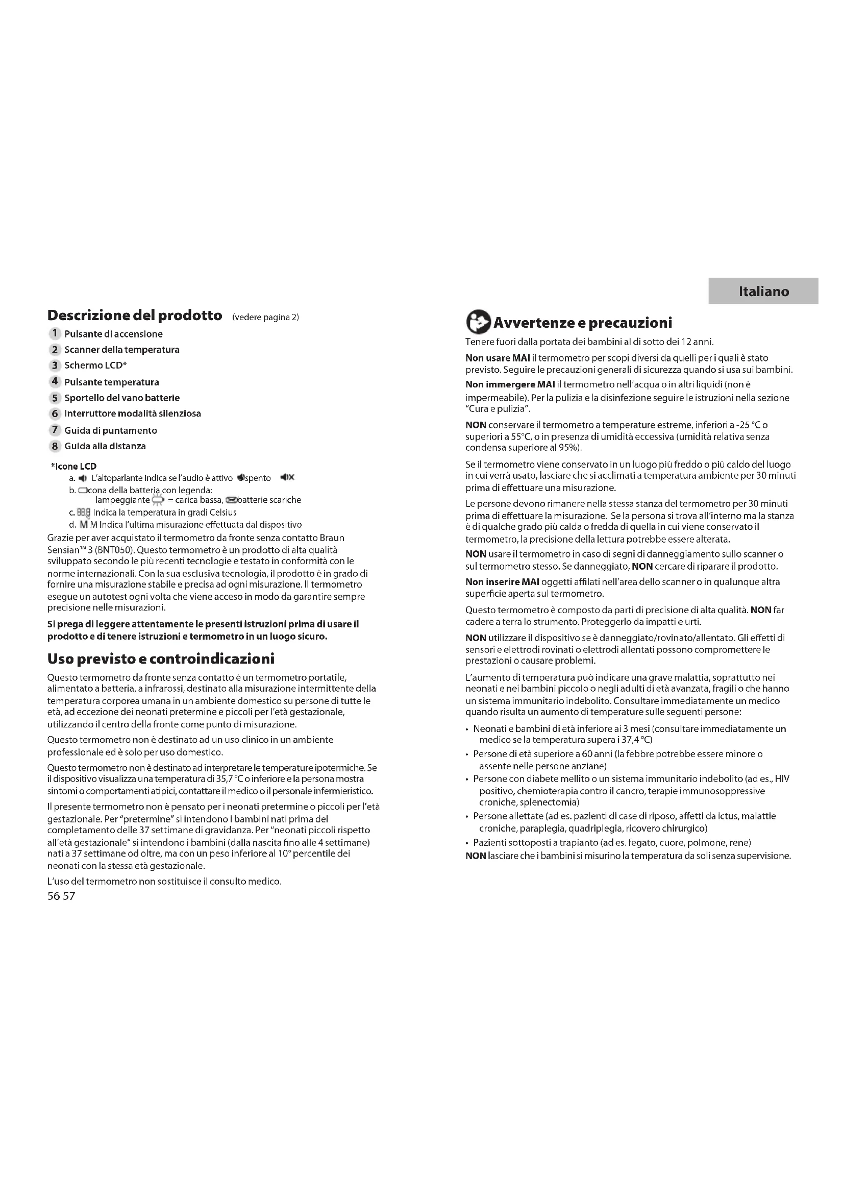 Guida alla distanza *Icone LCD L’altoparlante indica se l’audio è attivo o spento b. Icona della batteria con legenda: lampeggiante = carica bassa, = batterie scariche Indica la temperatura in gradi Celsius M Indica l’ultima misurazione eettuata dal dispositivo Grazie per aver acquistato il termometro da fronte senza contatto Braun Sensian™ 3 (BNT050). Questo termometro è un prodotto di alta qualità sviluppato secondo le più recenti tecnologie e testato in conformità con le norme internazionali. Con la sua esclusiva tecnologia, il prodotto è in grado di fornire una misurazione stabile e precisa ad ogni misurazione. Il termometro esegue un autotest ogni volta che viene acceso in modo da garantire sempre precisione nelle misurazioni. Si prega di leggere attentamente le presenti istruzioni prima di usare il prodotto e di tenere istruzioni e termometro in un luogo sicuro. Uso previsto e controindicazioni Questo termometro da fronte senza contatto è un termometro portatile, alimentato a batteria, a infrarossi, destinato alla misurazione intermittente della temperatura corporea umana in un ambiente domestico su persone di tutte le età, ad eccezione dei neonati pretermine e piccoli per l’età gestazionale, utilizzando il centro della fronte come punto di misurazione. Questo termometro non è destinato ad un uso clinico in un ambiente professionale ed è solo per uso domestico. Questo termometro non è destinato ad interpretare le temperature ipotermiche. Se il dispositivo visualizza una temperatura di 35,7 °C o inferiore e la persona mostra sintomi o comportamenti atipici, contattare il medico o il personale infermieristico. Il presente termometro non è pensato per i neonati pretermine o piccoli per l’età gestazionale. Per “pretermine” si intendono i bambini nati prima del completamento delle 37 settimane di gravidanza. Per “neonati piccoli rispetto all’età gestazionale” si intendono i bambini (dalla nascita no alle 4 settimane) nati a 37 settimane od oltre, ma con un peso inferiore al 10° percentile dei neonati con la stessa età gestazionale. L’uso del termometro non sostituisce il consulto medico. Avvertenze e precauzioni Tenere fuori dalla portata dei bambini al di sotto dei 12 anni. Non usare MAI il termometro per scopi diversi da quelli per i quali è stato previsto. Seguire le precauzioni generali di sicurezza quando si usa sui bambini. Non immergere MAI il termometro nell’acqua o in altri liquidi (non è impermeabile). Per la pulizia e la disinfezione seguire le istruzioni nella sezione “Cura e pulizia”. NON conservare il termometro a temperature estreme, inferiori a -25 °C o superiori a 55°C, o in presenza di umidità eccessiva (umidità relativa senza condensa superiore al 95%). Se il termometro viene conservato in un luogo più freddo o più caldo del luogo in cui verrà usato, lasciare che si acclimati a temperatura ambiente per 30 minuti prima di eettuare una misurazione. Le persone devono rimanere nella stessa stanza del termometro per 30 minuti prima di eettuare la misurazione. Se la persona si trova all’interno ma la stanza è di qualche grado più calda o fredda di quella in cui viene conservato il termometro, la precisione della lettura potrebbe essere alterata. NON usare il termometro in caso di segni di danneggiamento sullo scanner o sul termometro stesso. Se danneggiato, NON cercare di riparare il prodotto. Non inserire MAI oggetti alati nell’area dello scanner o in qualunque altra supercie aperta sul termometro. Questo termometro è composto da parti di precisione di alta qualità. NON far cadere a terra lo strumento. Proteggerlo da impatti e urti. NON utilizzare il dispositivo se è danneggiato/rovinato/allentato. Gli eetti di sensori e elettrodi rovinati o elettrodi allentati possono compromettere le prestazioni o causare problemi. L’aumento di temperatura può indicare una grave malattia, soprattutto nei neonati e nei bambini piccolo o negli adulti di età avanzata, fragili o che hanno un sistema immunitario indebolito. Consultare immediatamente un medico quando risulta un aumento di temperature sulle seguenti persone: